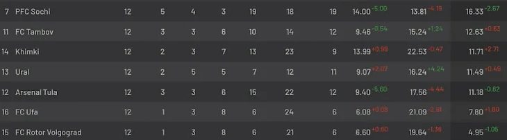 "Спартак" явно перебирает очки, по уровню игры красно-белые всего лишь пятые и перебрали 7! очков, что крайне много. Исходя из данных, можно предположить, что в ближайшее время у команды будет спад