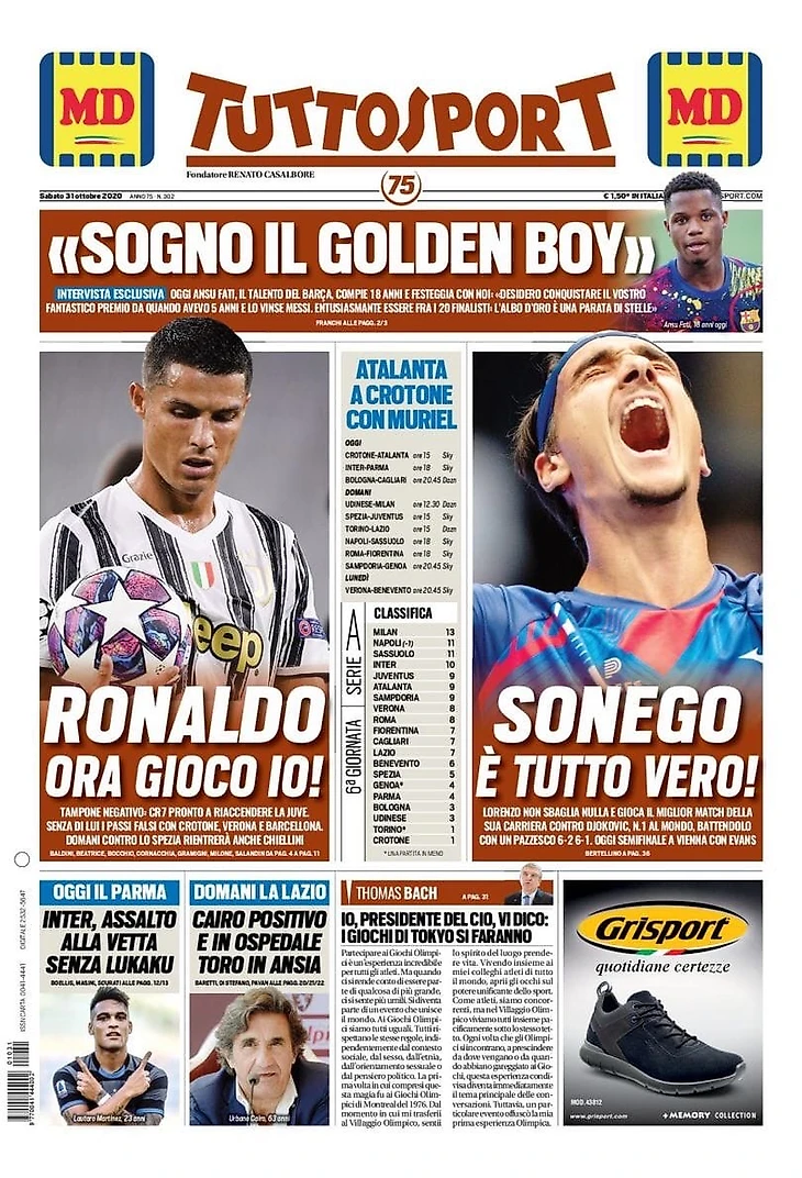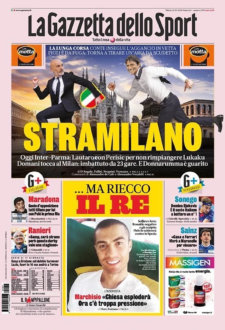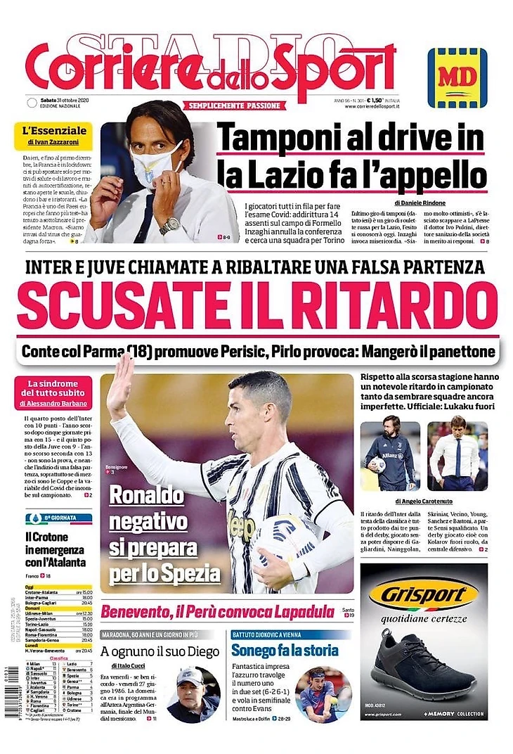 Попытка «Интера» без Лукаку обыграть «Парму» и догнать на вершине «Милан», отрицательный тест у Роналду, а также тяжёлая ситуация с заболевшими в «Лацио» – в утреннем обзоре заголовков итальянских спортивных изданий в блоге «В гостях у Кальчо».