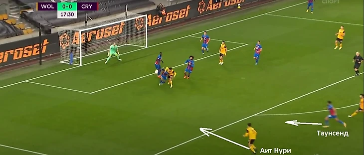 Стоит взять во внимание тот факт, что первый гол «волки», а именно Аит-Нури, забили за счет того, что крайний защитник смог без опеки со стороны соперника подключится к атаке в свободном пространстве. Тот игрок, который должен был его опекать – Таунсенд.