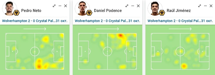 3. Перемещение игроков «Вулверхэмптона» в рамках схемы. Педру Нету и Поденсе периодически менялись флангами. Это можно заметить и на тепловой карте игроков. Однако большую часть времени футболисты занимали исключительно свои позиции. К тому же, Поденсе забил гол, вбегая в штрафную площадь со своего левого фланга. На правом фланге его функции ограничивались подачами в штрафную площадь. Но после возвращения на левый край, при получении мяча использовал смещения в центр. Кроме этого, оба игрока при переходе команды в фазу обороны опускались на своих флангах в линию полузащиты.