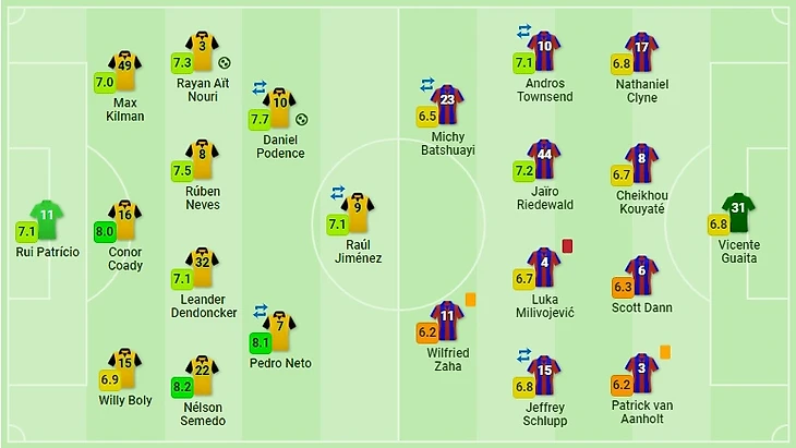 Седьмой тур Английской Премьер-Лиги открывала встреча между «Вулверхэмптоном» и «Кристал Пэлас» на стадионе «Молинью». Матч закончился со счетом 2:0 в пользу коллектива Нуну Эшпириту Санту. Стоит отметить, что оба гола были забиты еще в первом тайме. Сперва отличился левый латераль Раян Аит-Нури, подключившись к атаке и забив гол в одно касание точно в нижний угол ворот. Второй мяч занес Даниэль Поденсе, замкнув подачу в штрафную площадь от Педру Нету.