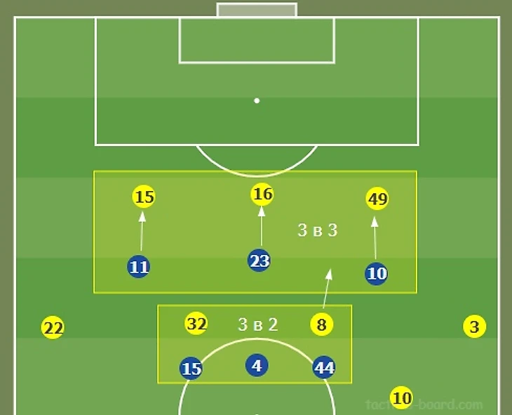 2. Построение атак «Вулверхэмптона» и прессинг «Пэласа» . Все начинается с трех центральных защитников. Крайние фулбеки поднимаются выше по флангу. Так как у «Пэлас» Таунсенд поднимался к паре нападающих, то складывалась ситуация 3 в 3. Это позволяло прессинговать защитников один в один, и перекрывать направления в центр, где три полузащитника «Пэлас» располагались очень узко. За счет этого свободными оставались фланги, куда можно было отдавать передачу. Для того, чтобы продвигать мяч в соседнюю зону, один из опорников, чаще всего это был Невеш, опускался чуть ниже под передачу. Таким образом, он делал численное преимущество в данной области. При получении мяча он переводил его на левый фланг Аит-Нури, либо делал вертикальную передачу в полуфланг на Поденсе.