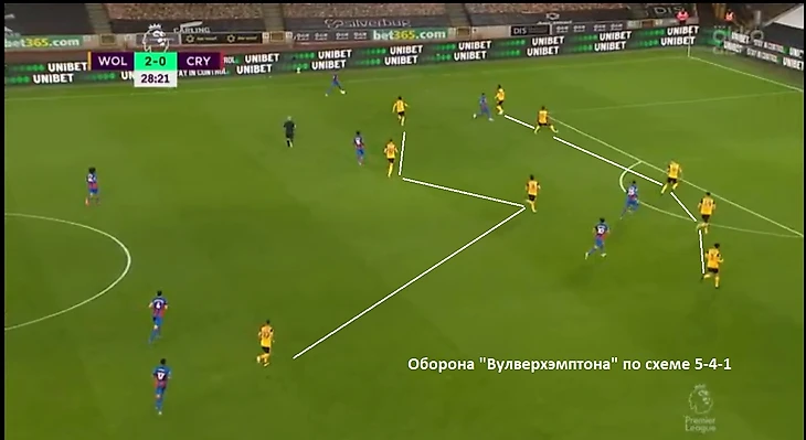 Команда встречала соперника с мячом преимущественно в средней трети поля. Высокого прессинга не наблюдалось, к тому же у «Пэлас» в линии обороны было четыре игрока против трех нападающих соперника. Это позволяло контролировать мяч без повышенного риска потерять его. По владению мячом «Пэлас» превзошел соперника – 45% против 55%. Это за счет того, что «волки» позволяли разыгрывать мяч через короткий пас с центральными защитниками. Игроки «Вулверхэмптона» опускались ниже в среднюю треть, перекрывая опорную зону, а при продвижении мяча соперником перестраивались по схеме 5-4-1. Таким образом, прикрывались фланги и потенциально опасные зоны в полуфлангах.