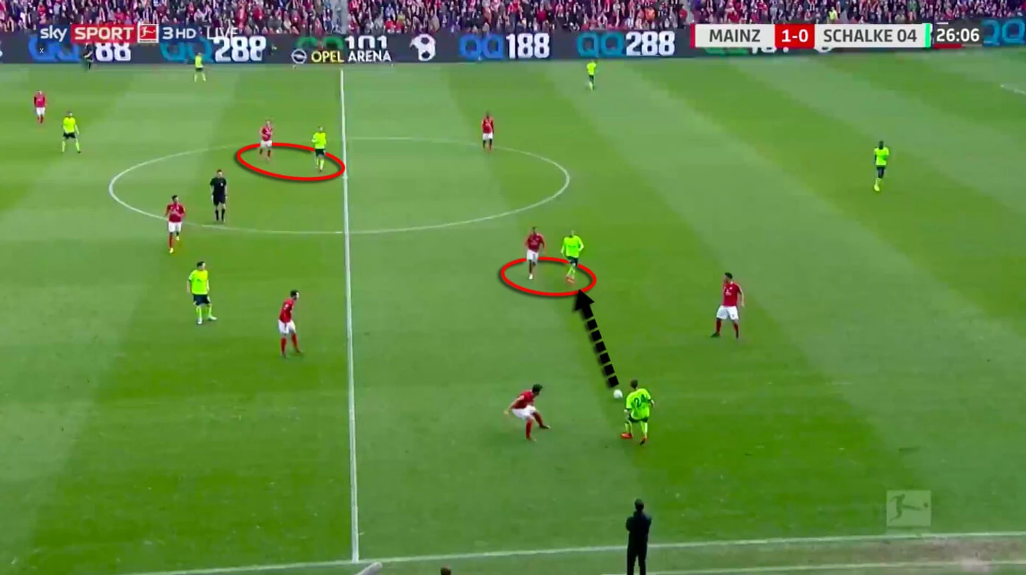 В этой роли в Майнце выступал ивуарийский француз Жан-Филипп Гбамен – нынешний игрок Эвертона. Как только он получает мяч (первая линия прессинга преодолена), оба крайних защитника поднимаются выше.