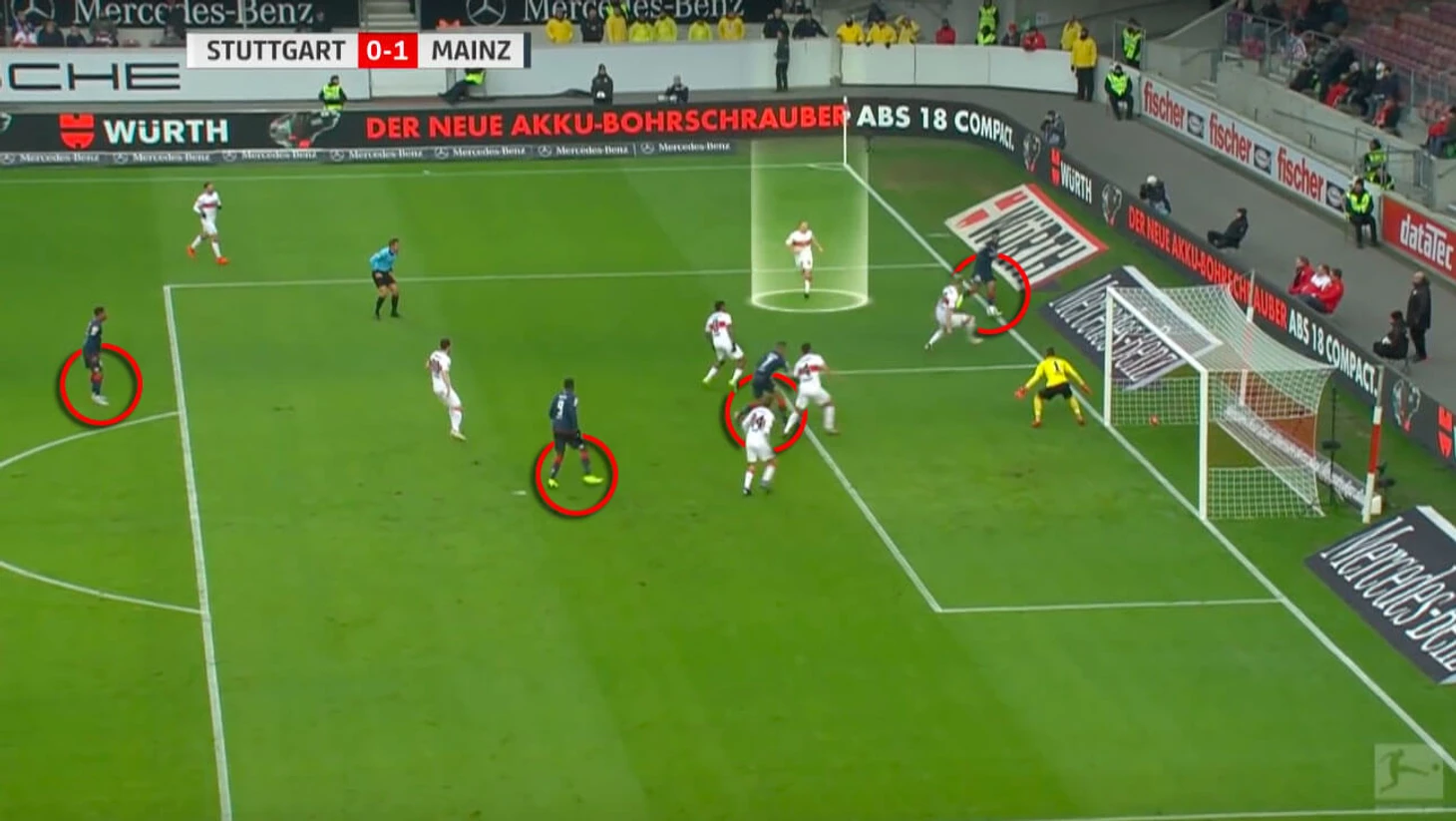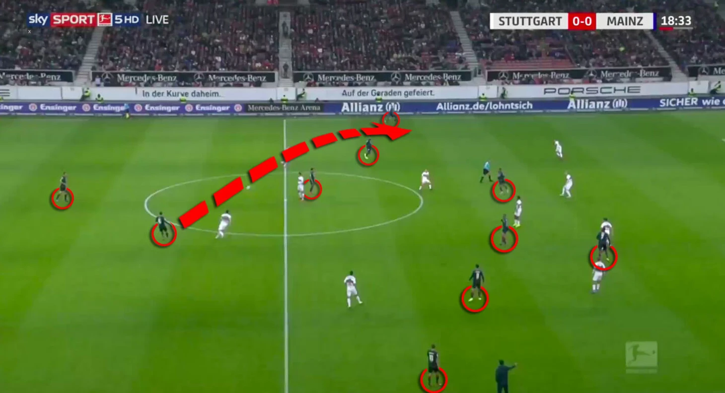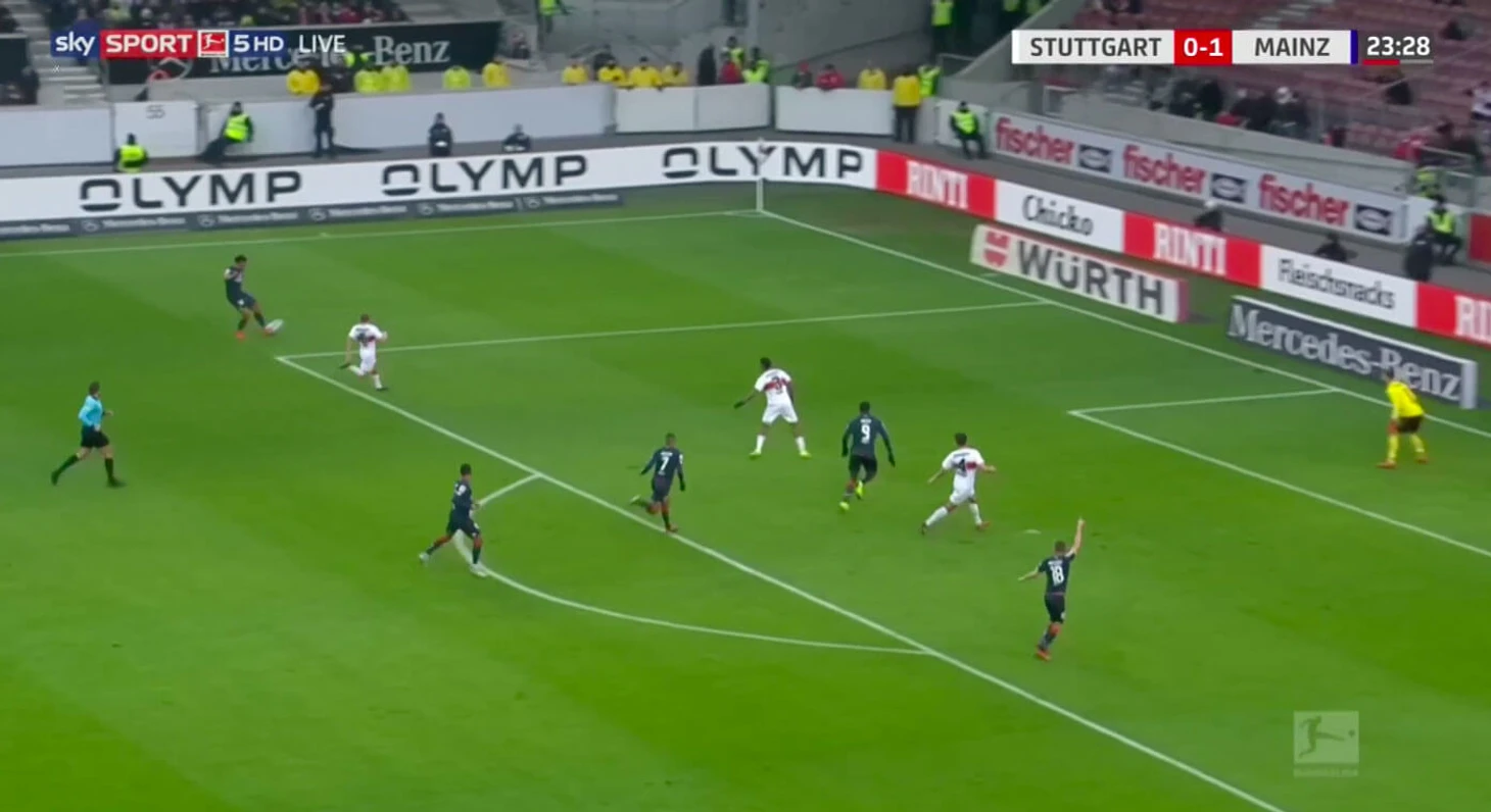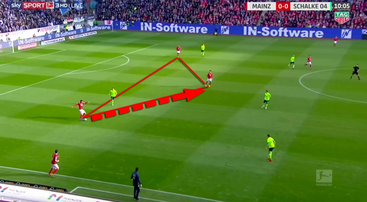 При подходах к штрафной, группа атаки Майнца любит использовать «разрезающие» пасы через линию защиты. Это еще одно следствие численного превосходства в центральной зоне. С двумя нападающими и четырьмя полузащитниками, играющими узко в центре, команда Шварца часто получала возможность вскрыть последнюю линию защиты передачами «в разрез».