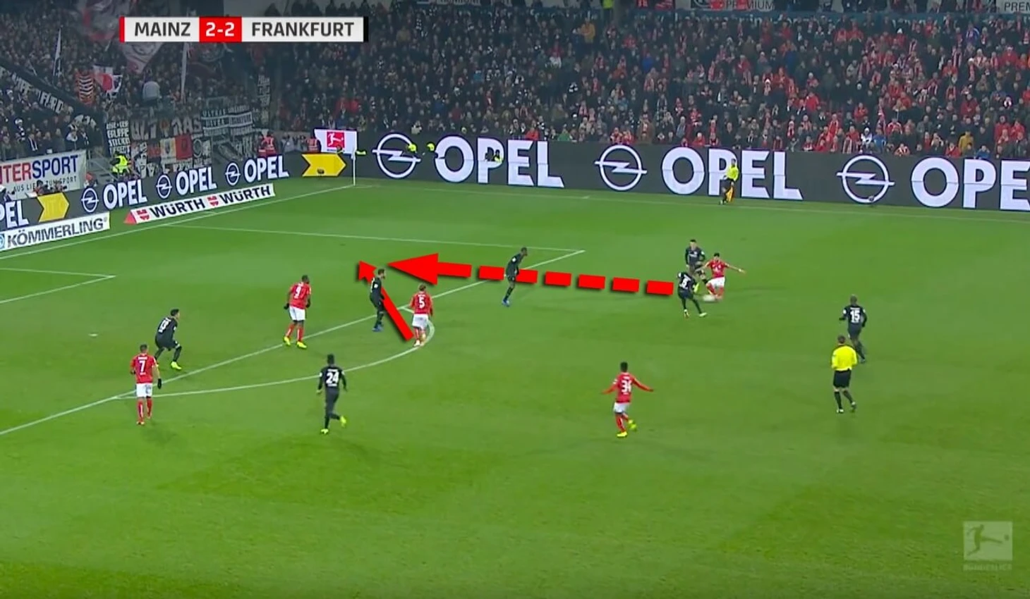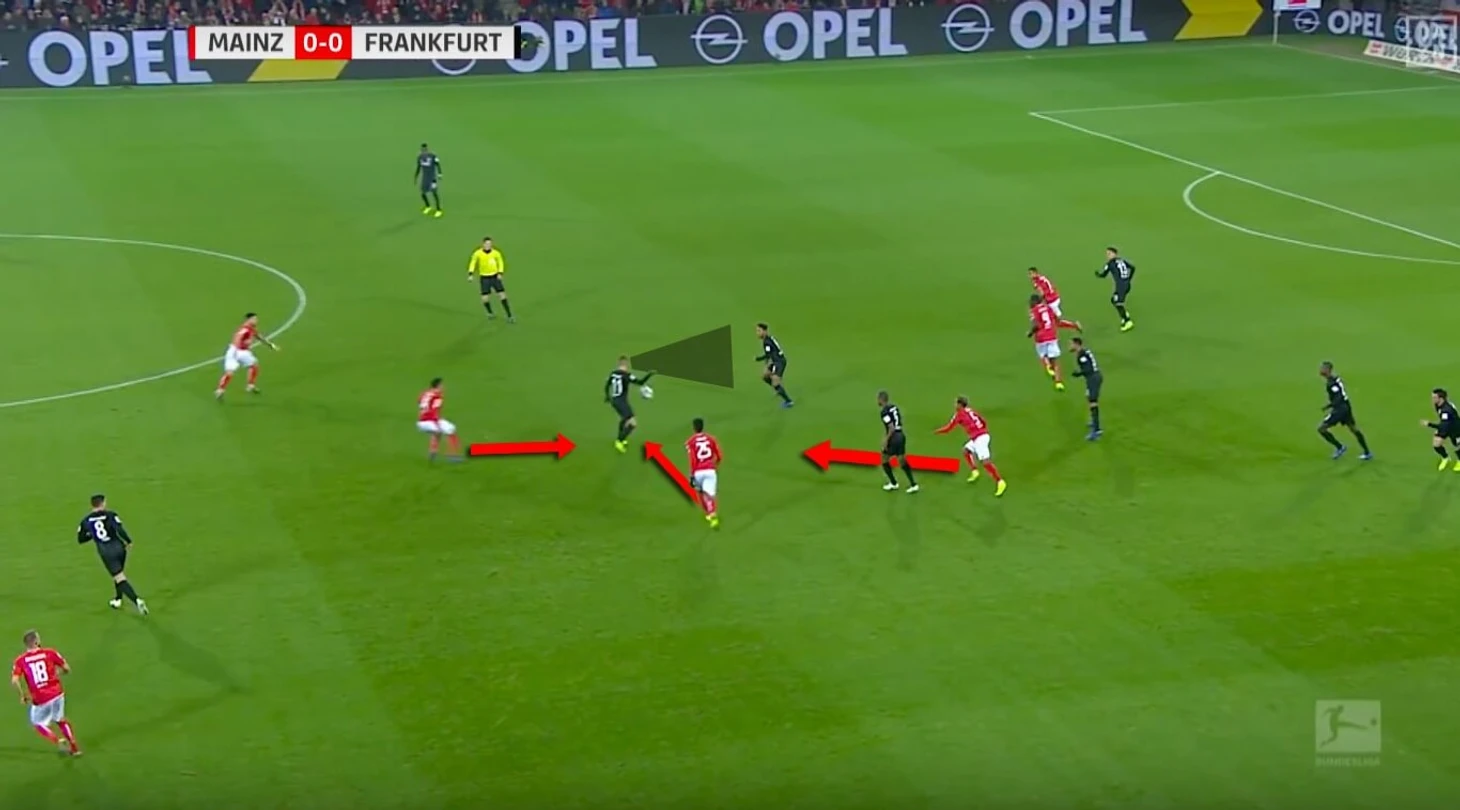 После заброса на форварда и сброса "в борьбу" Майнц прессингует полузащиту Франкфурта в «слепой зоне»