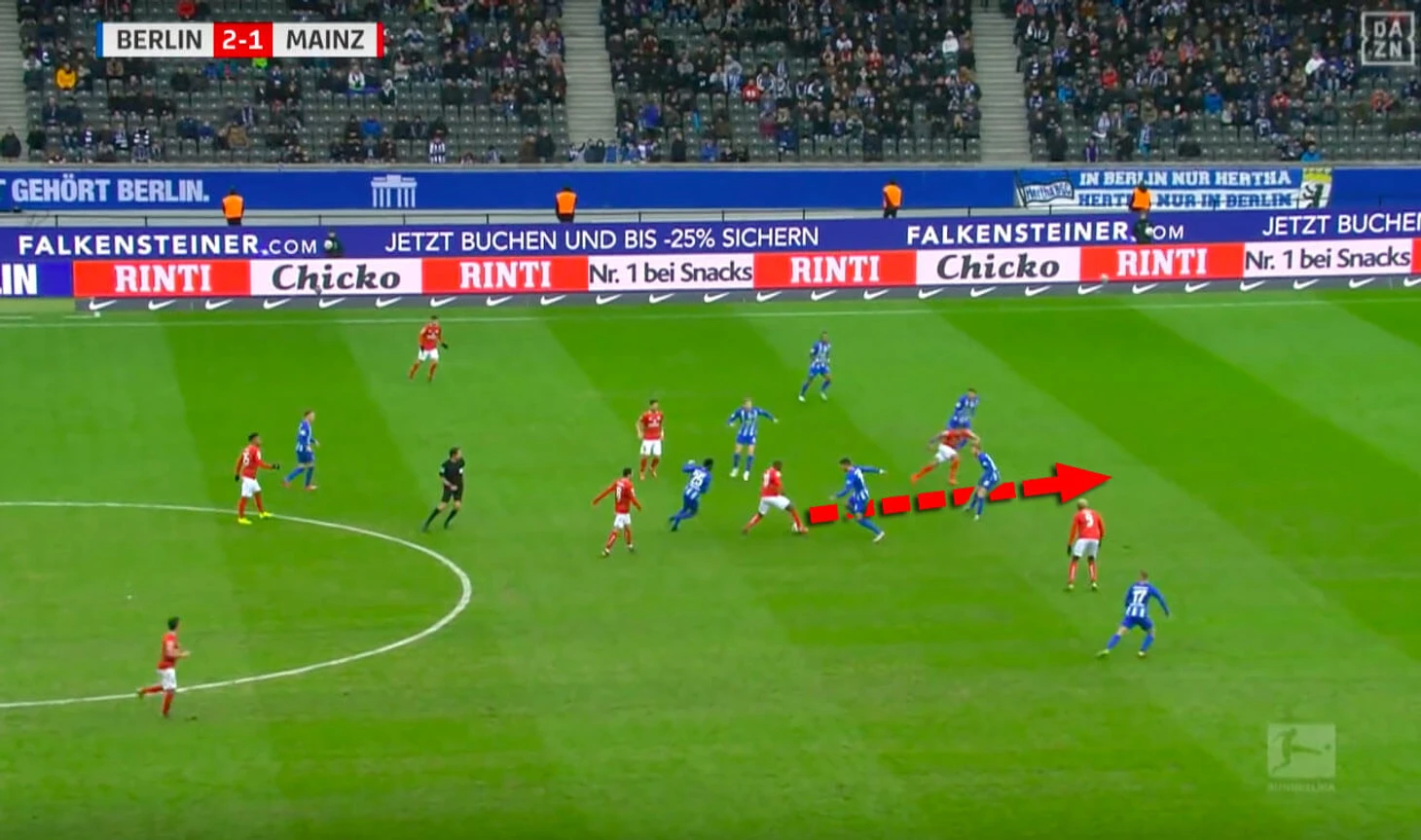 В этом случае присутствие в атаке крайних защитников Майнца не позволяет крайним защитникам соперника страховать своих центральных, в результате чего они оказываются в изоляции и ситуации 1-в-1 с нападающими.