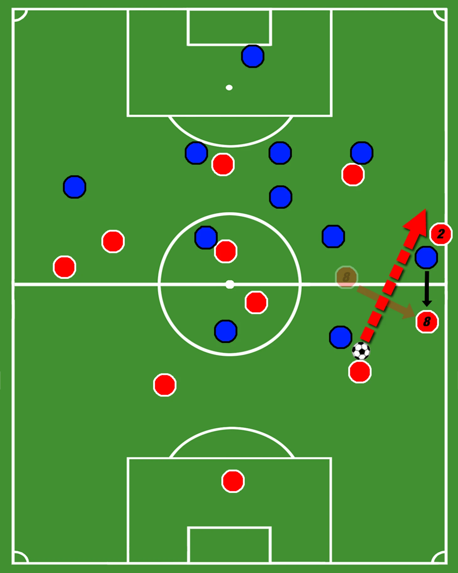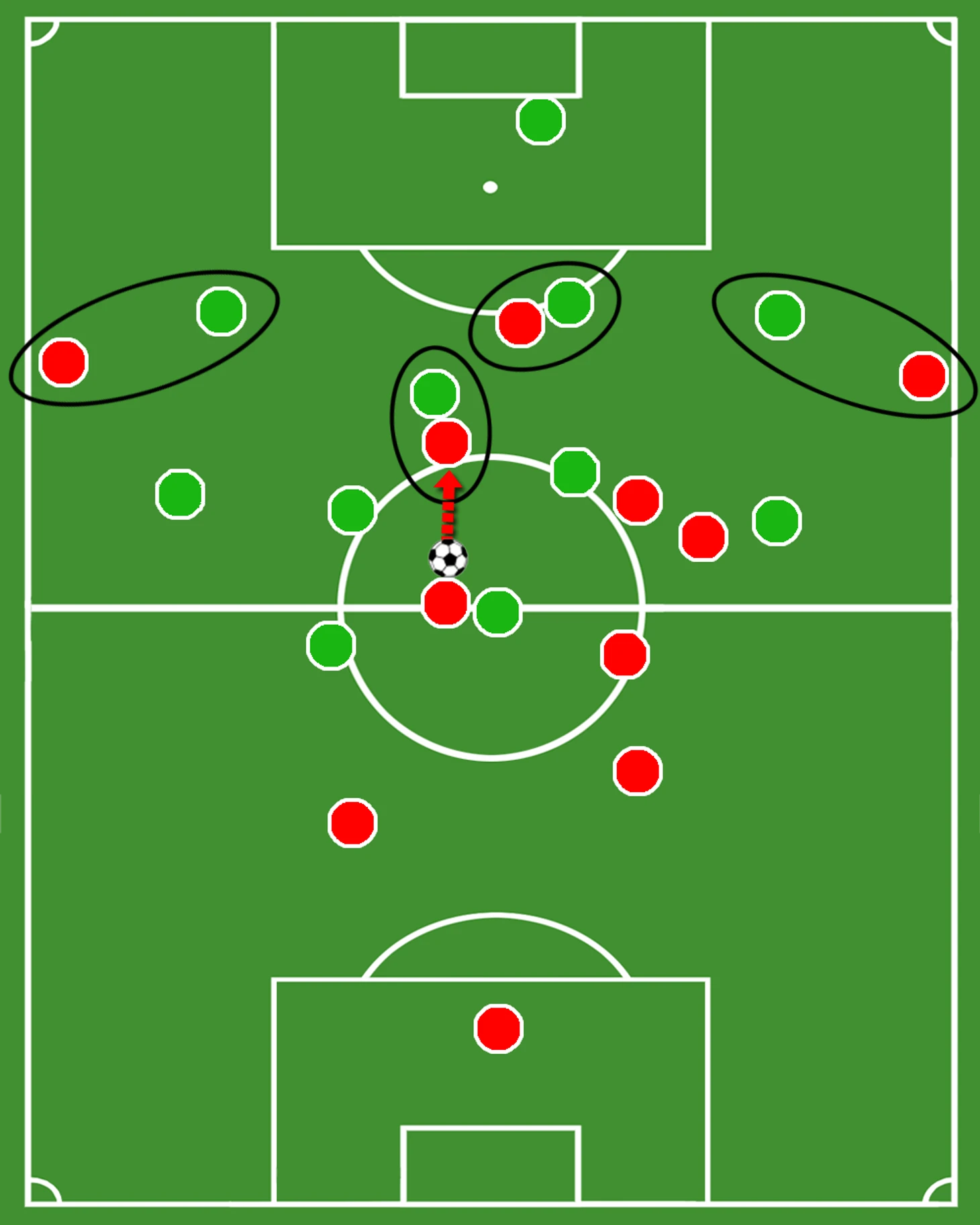 Полузащита разобрала своих игроков. Видно, что игрок в центре получает возможность совершить перехват благодаря плотной персональной опеке.