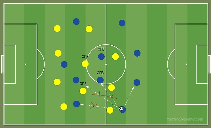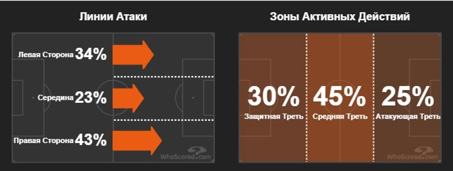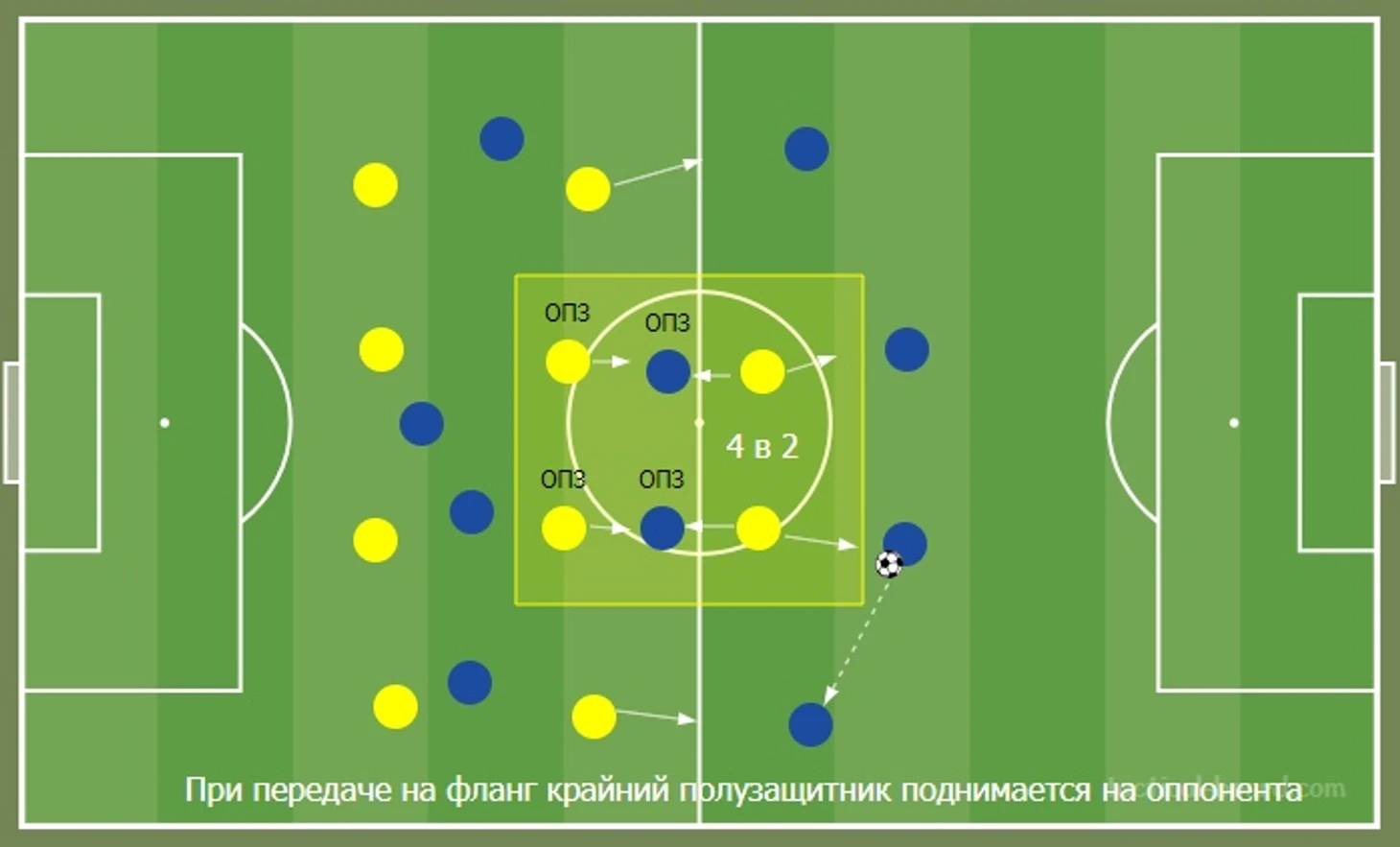Однако подобный оборонительный блок вскрывается за счет быстрого перемещения мяча, активных переводов с фланга на фланг и класса игроков. Последнее важно в плане комбинационных действий с использованием коротких/средних передач.