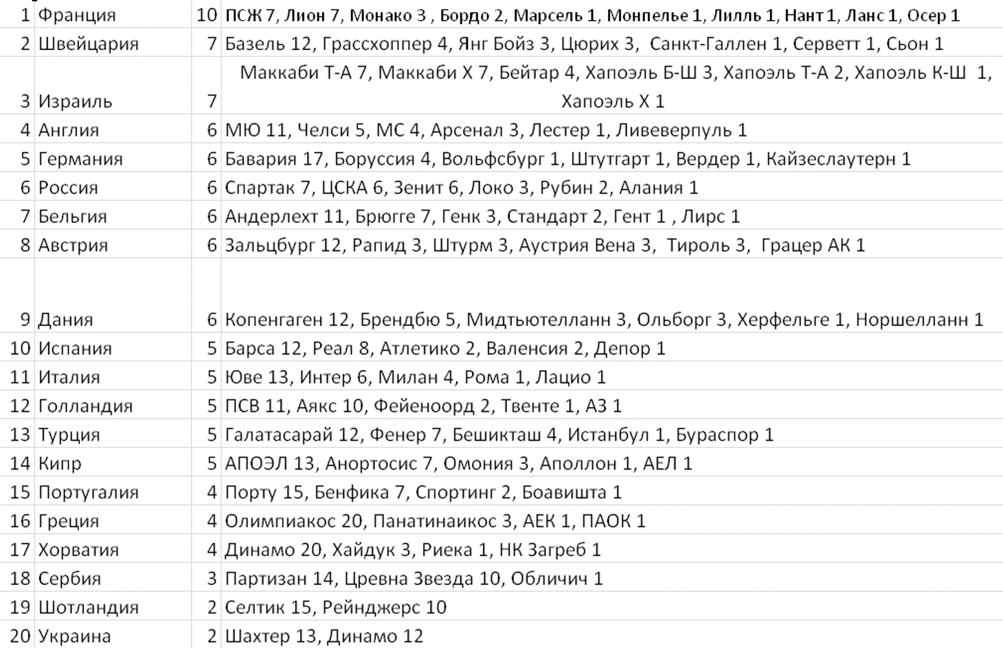 И по этому критерию у французов самый интересный чемпионат, причём они лидируют с большим отрывом - сразу 10 команд! Израильтяне с 7 клубами делят вторую строчку со Швейцарией, у нас 6 клубов, как ещё и у 5 стран. У шотландцев и украинцев количество претендентов на чемпионство не поражает воображение. Но это ожидаемо, был уверен, что те же 2 чемпиона будут и в Сербии, но, оказывается, ещё во времена Югославии чемпионат выигрывал какой-то Обличич.