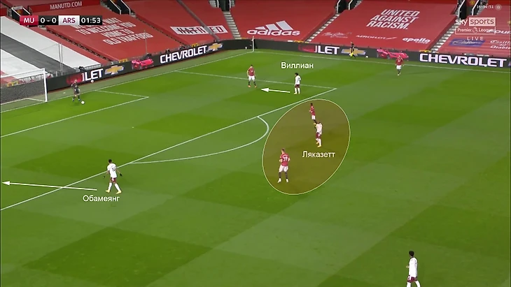 При прессинге «Арсенал» регулярно повторял один и тот же сценарий. Обамеянг и Виллиан оказываются выше Ляказетта и играют по центральным защитникам. Ляказетт оказывается один против Мактомини и Фреда (которые в этой стадии как раз были частью квадрата, а не ромба).