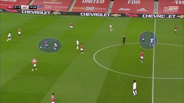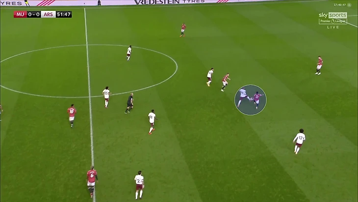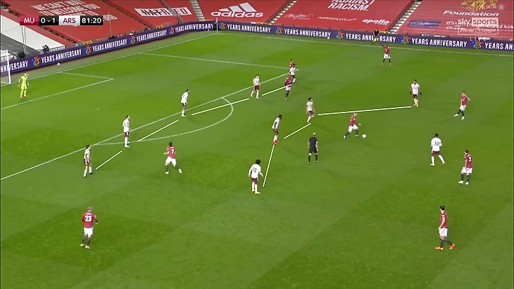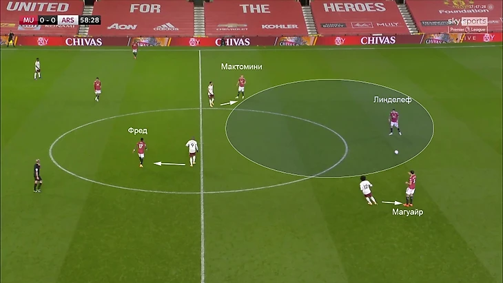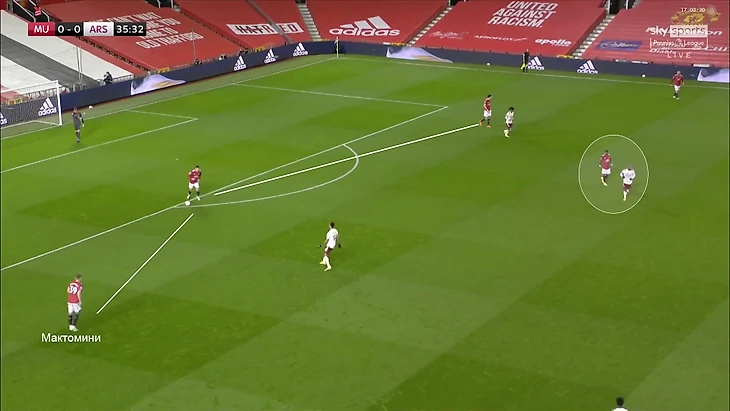 В идеальном сценарии Ляказетт старался контролировать обоих (и так мощно пахал, что иногда получалось). Если же это было невозможно, он концентрировался на Фреде, а Мактомини получал свободу. Кажется, Артета ставил на то, что «МЮ» недостаточно быстро находит свободного игрока в первой стадии (особенно если не готов к такому типу прессинга – с «РБ» были отлично готовы), а Мактомини недостаточно хорош на мяче, даже если получит свободу. И то, и другое вполне оправданно.