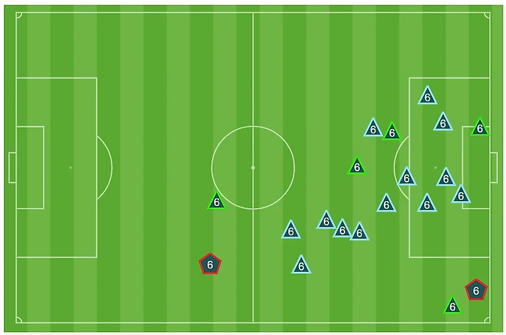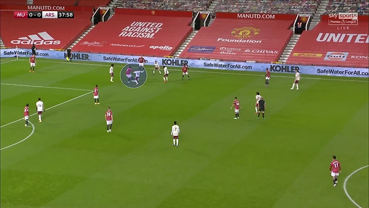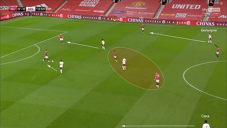 Именно в центральной зоне у «МЮ» был свободный игрок. Все остальные направления, включая фланговых защитников, перекрывались. Для этого высоко выдвигались Сака и Бельерин (важное отличие от прессинга «Лейпцига»):