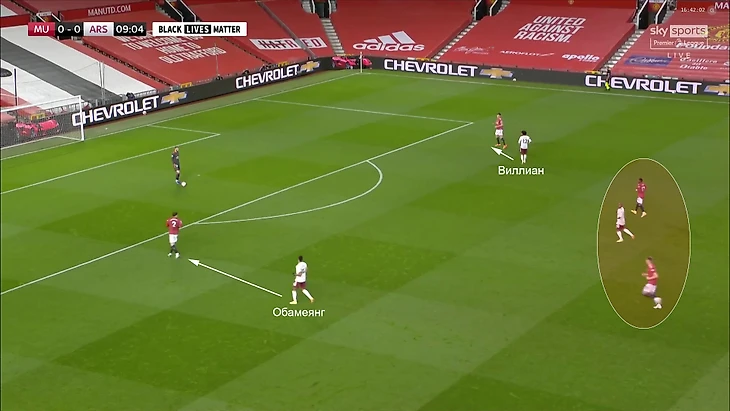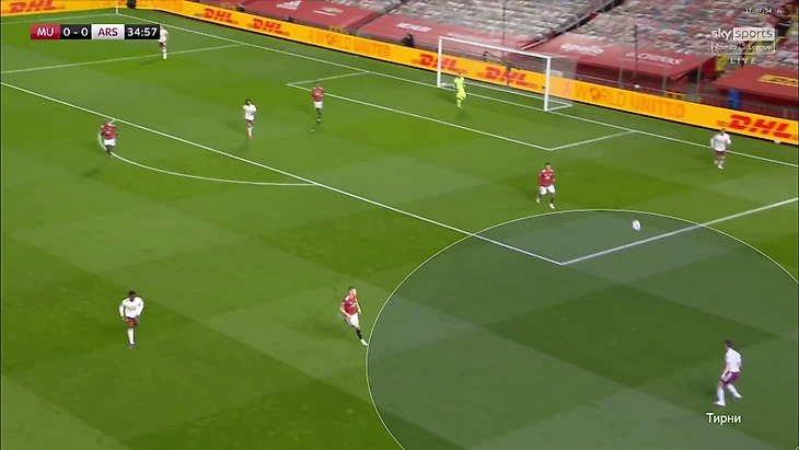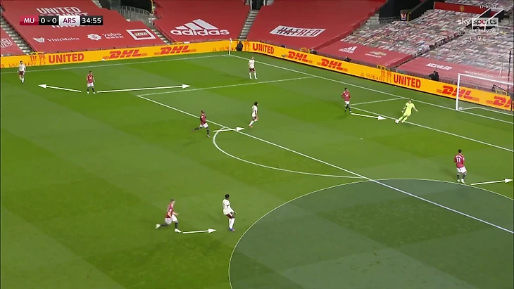 Против структуры прессинга «Арсенала» это самый очевидный прием. Странно, что «Юнайтед» не прочитал ситуацию без помощи тренера и не использовал его чаще. В первом тайме он встречался, но был совсем эпизодическим.