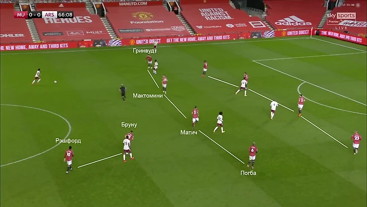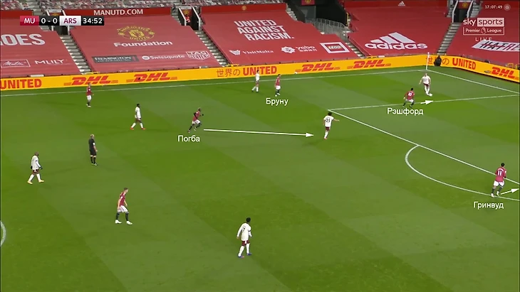 Ромб «МЮ» растягивается, чтобы накрыть фланг. Бруну прикрывает Бельерина, а Погба смещается на его позицию: