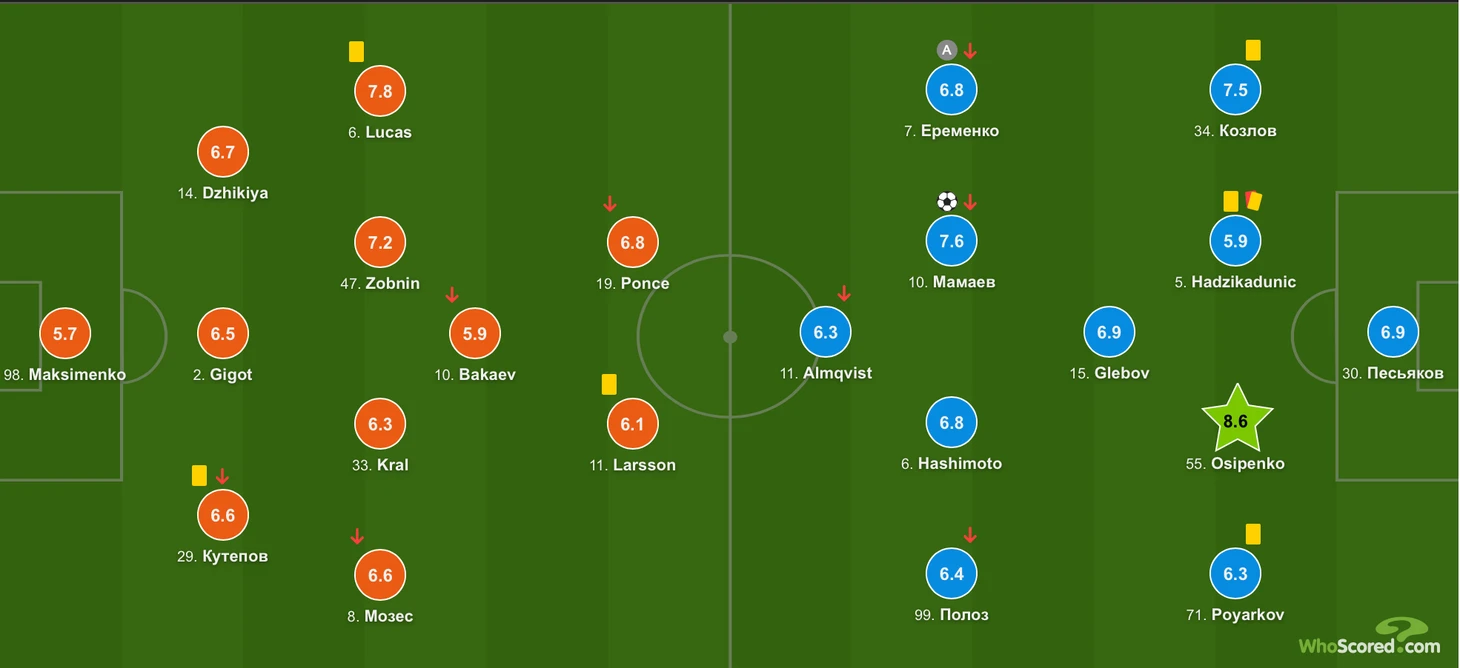 А вот Мозес начинает впечатлять: его уровень ТТД очень хорош - 2 отбора мяча из 2 попыток, 1 перехват, 2 успешных попытки обыгрыша. На момент ухода с поля Мозес больше Айртона и получал мяч, и делал передач (74 против 64 касаний, 57 против 44 передач). В сегодняшнем матче, до выхода Соболева, нападающие "Спартака" не смогли противопоставить себя прекрасно сыгравшим Хаджикадуничу и Осипенко, поэтому и вспоминать действия нигерийца мы может только по опять, как кажется, его ленивому бегу назад. Но, на мой взгляд, что и у Мозеса, и у Айртона в принципе допустимы такие ошибки: защитники и опорники должны страховать фланг чуть ли не больше вышеперечисленных. А вот роль Бакаева как разыгрывающего действительно может терять смысл - "Спартаку" нужен более глубинный игрок с пасом, чтобы остальные могли не переживать за потерянные зоны. Зелимхан же при обороне часто пассивен и не может дать достаточный объем - Тедеско даже в матчах, где был доволен действиями Бакаева, все равно регулярно его меняет.
