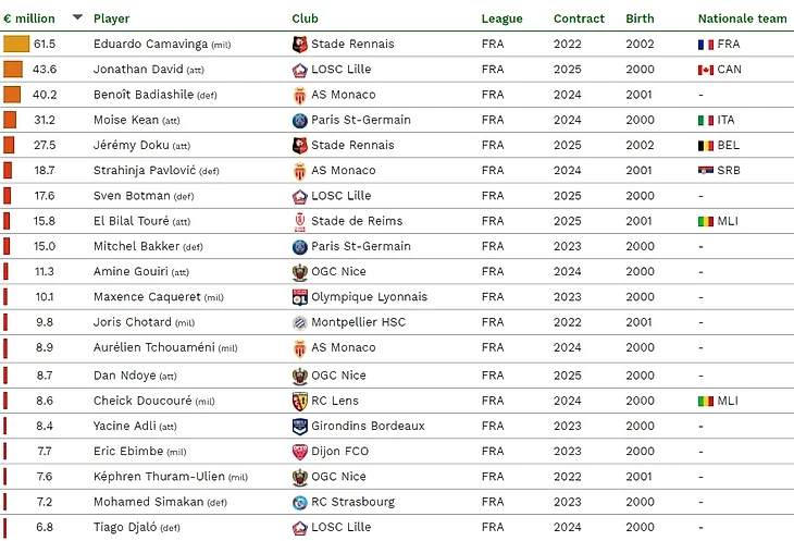 Футбольная обсерватория CIES составила рейтинг самых дорогих молодых игроков. Во французской Лиге 1 таковым является полузащитник "Ренна" Эдуардо Камавинга, который уже летом может перебраться в "Реал". Его стоимость - 61,5 миллиона евро.