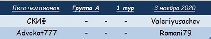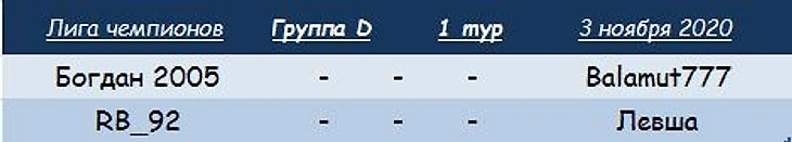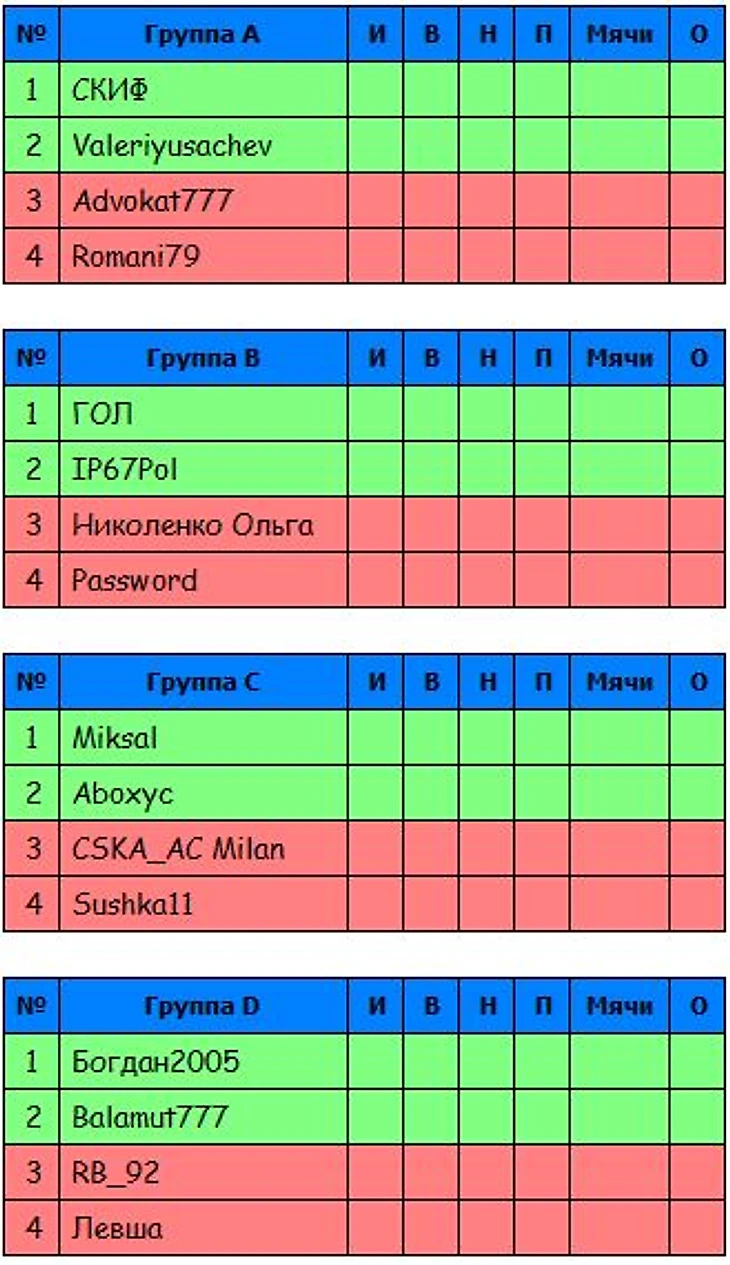 Хотел, было дело, оценить составы групп по силе, но передумал. Если кому интересно, самой сильной группой (по суммарному рейтингу участников) является квартет с литерой "A". Однако, не стоит забывать, что среди участников сразу двое новичков: Password и Sushka11. Ранее, они не участвовали в розыгрышах Лиги Чемпионов. Оценить их силу - не получится. При этом, их рейтинг, на данный момент, равен нулю, что рушит показатели групп B и C