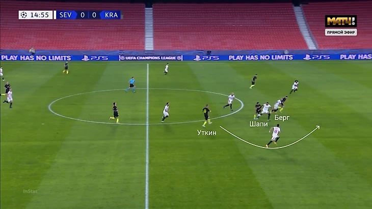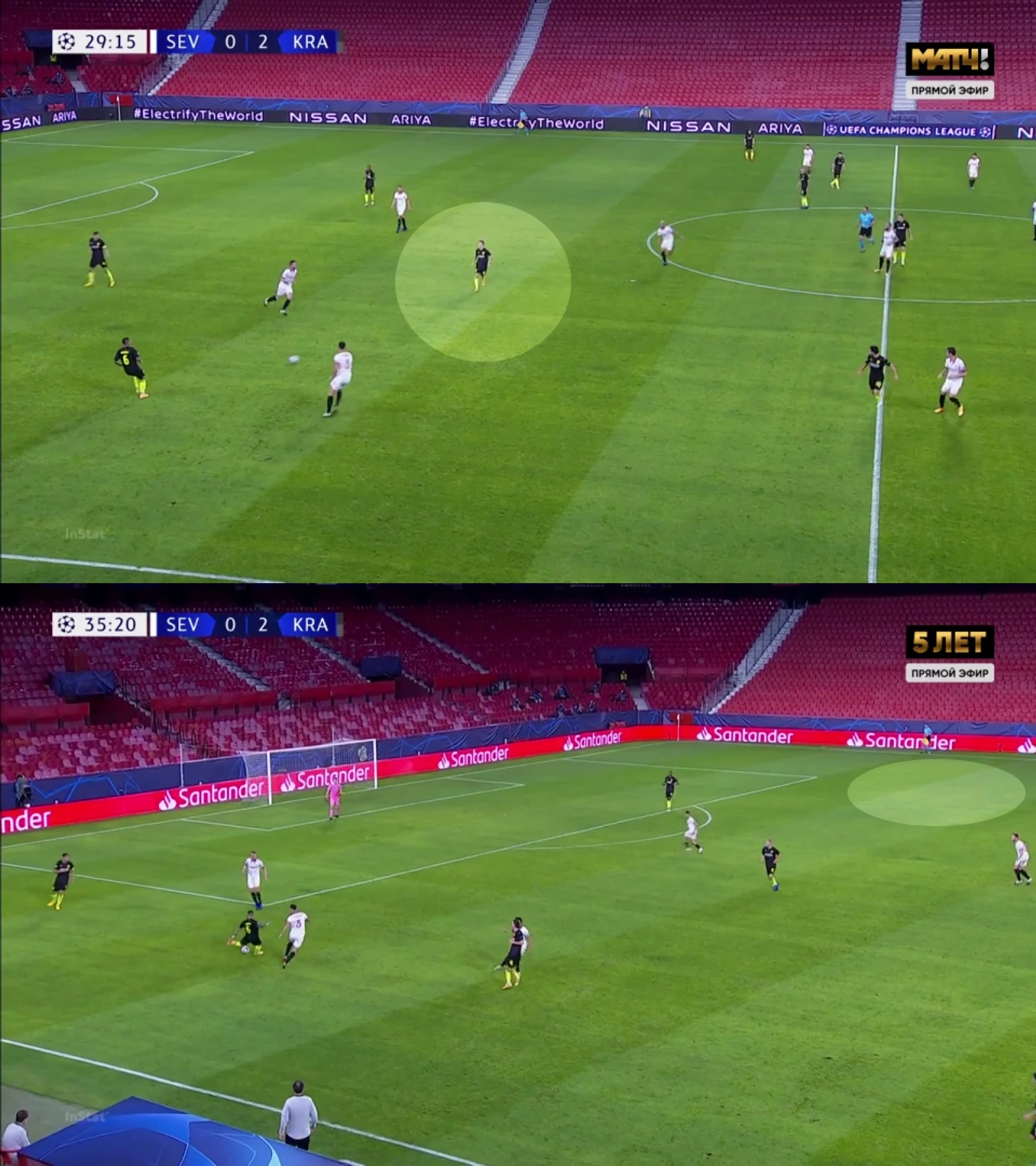 Хорошо работали переводы: «Севилья» формирует пружину в центре поля, фланговые игроки «Краснодара» вынуждены сместиться в центр, а перевод на открытый край разбивал это построение.
