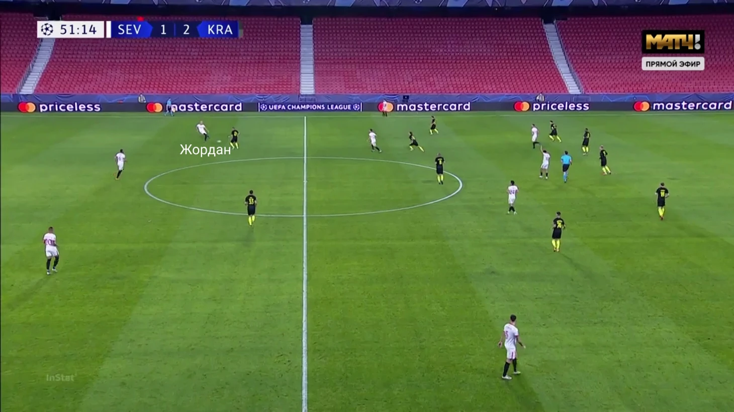Вывод: «Краснодар» полностью проиграл центр поля, поэтому откатился глубоко назад. Доминирование «Севильи» сложилось из-за неумелого прессинга Берга и Уткина. Преодолевая первую фазу прессинга, испанцы заполняли свободные зоны в центре поля и растягивали защиту с целью перевести мяч на фланг. Дополнительное подспорье для контроля – слабая игра Чернова и Сабуа/Сперцяна 1-в-1, это дало Навасу полную свободу действий.