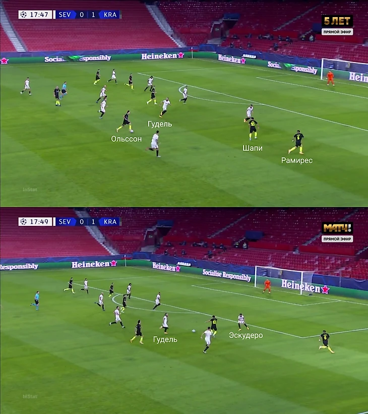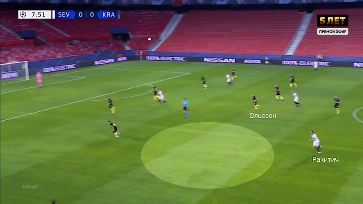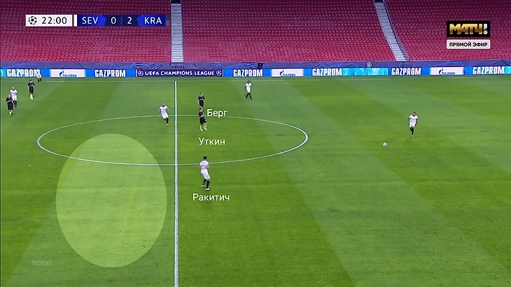 4. Главная проблема «Краснодара», от которой шли остальные – оборванный прессинг. Уткин и Берг находились за линией мяча, не мешая розыгрышу «Севильи».