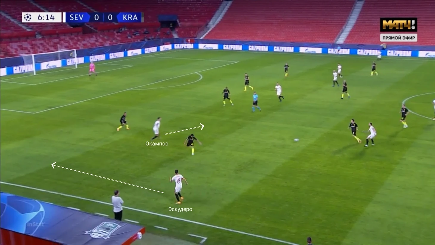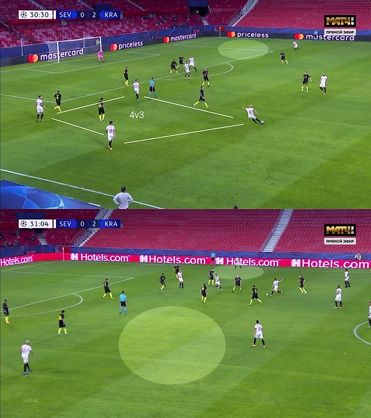 5. «Севилья» легко раскачивала «Краснодар». Другой распространенный маневр – создание свободных зон фланговыми игроками. Защитник включался по краю, а вингер уводил своего оппонента в центр.