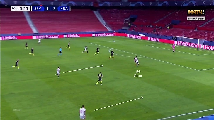 Ключ к спокойному завершению игры – выход Рекика вместо Де Йонга. «Севилья» перешла на игру в три центральных защитника – это усложнило передвижения Вандерсону и закрыло ему дорогу к воротам через полуфланг.