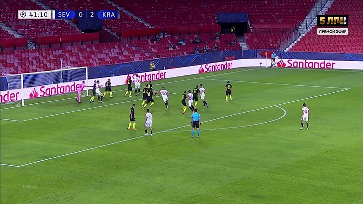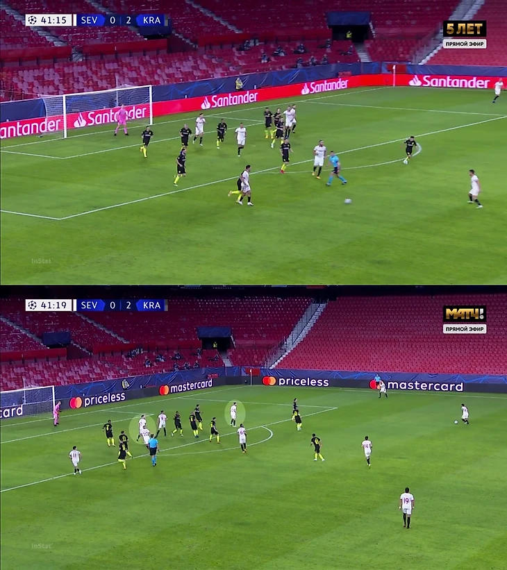11. Чем дальше трансформировалась «Севилья», тем очевиднее становилось стремление численно превосходить «Краснодар» около штрафной. Это видно на последнем скрине.