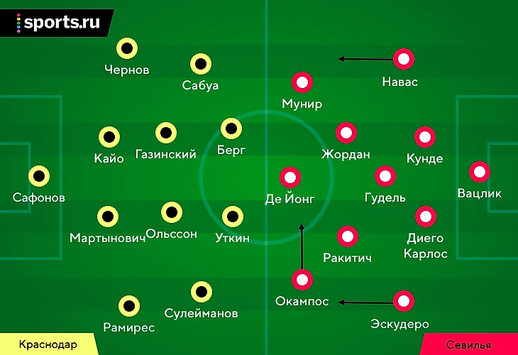 • Удаление у «Севильи» случилось очень вовремя: фланг Чернова разваливался, второй гол приближался, но Хесус Навас нарвался на красную карточку. Казалось, что после перерыва полегчает, но «Краснодар» еще сильнее вжался в ворота и не мог забрать мяч, пока «Севилья» не вышла вперед.