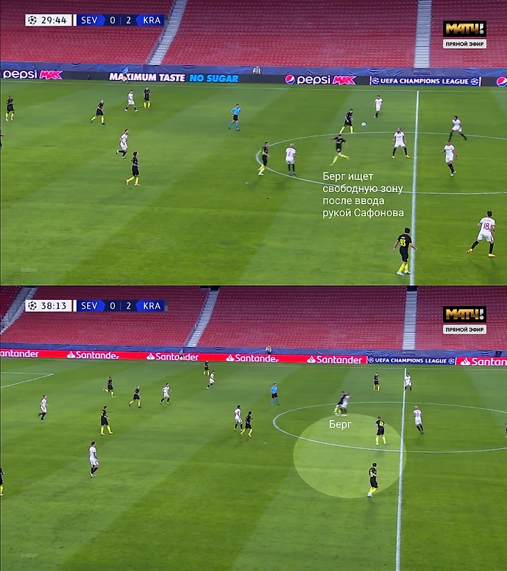 Классная черта Матвея – передачи руками. В Севилье они были редким шансом начать позиционную атаку. Здесь помогал Берг, который неоднократно покидал зоны центральных защитников, откликаясь на передачи от Сафонова.