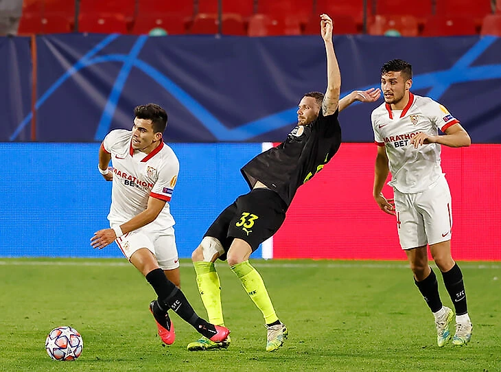 • После второго мяча «Краснодар» откатился назад – «Севилья» рвала правый фланг и контролировала центр поля. Огня добавили замены Лопетеги: Хулен убрал чудом не удалившегося Кунде и примитивно игравшего Эскудеро – вместо них вышли Акунья и Оскар Родригес. Гудель стал центральным защитником, а его место занял Ракитич.