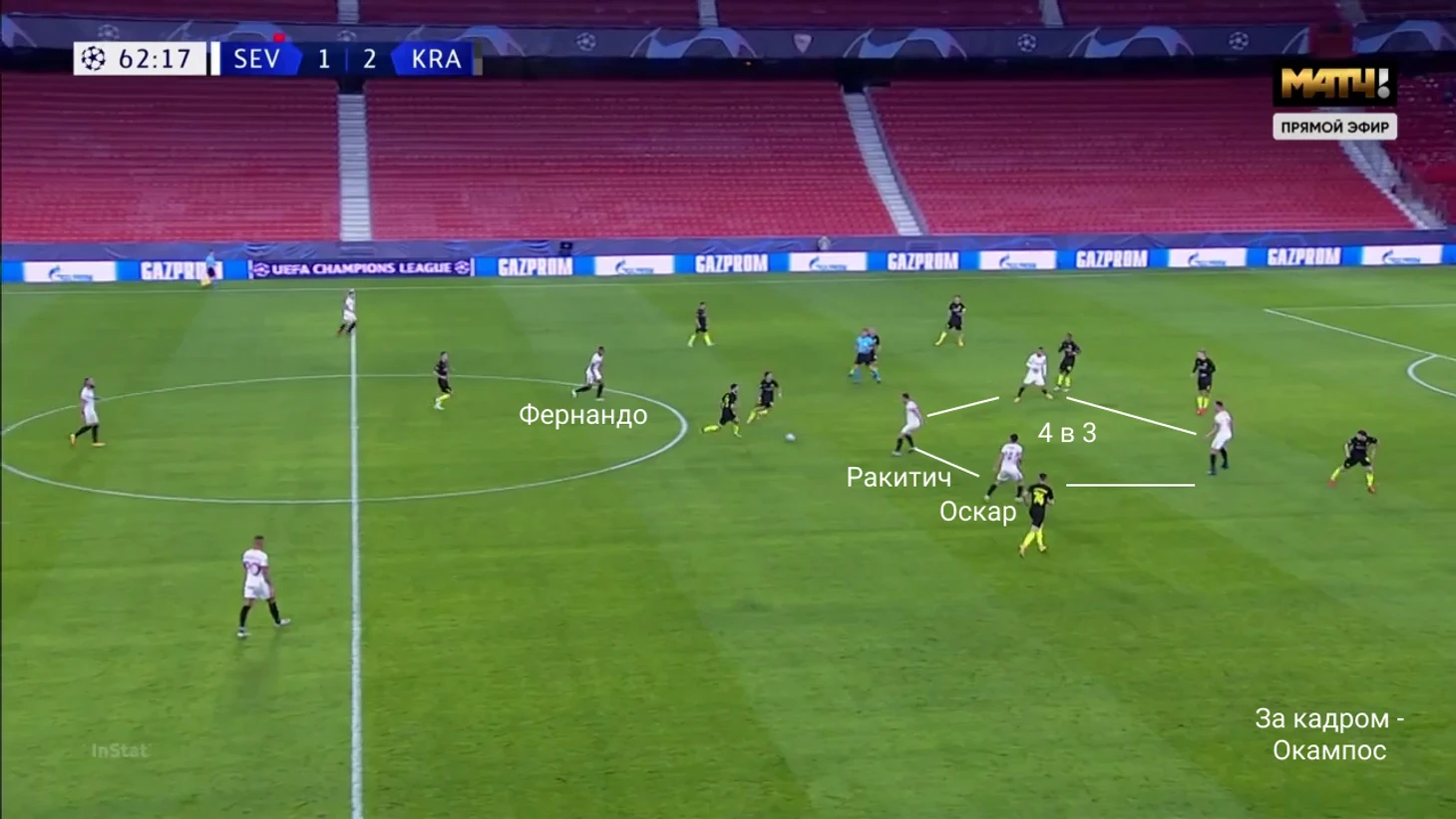 Ситуация усложнялась, когда к голланду подтягивались Родригес и Ракитич. По сути, «Севилья» в меньшинстве стала владеть численным превосходством в той зоне, где ей нужно.