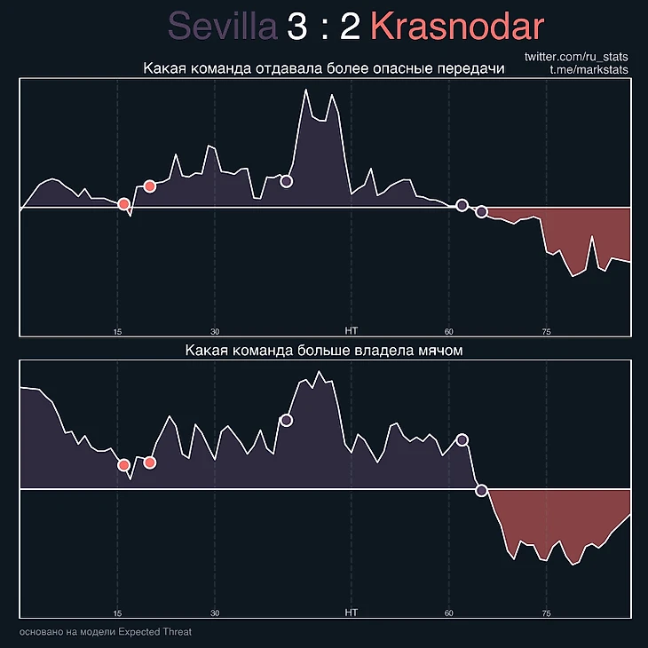 В первом тайме «Краснодар» удивил высокой эффективностью в атаке: две технические ошибки «Севильи» + одна позиционная превращены в два гола + удаление. Однако за пределами этих эпизодов «Краснодар» ничего не создал. Тренерский штаб должен задать себе вопросы: почему команда больше ничего не показала; как так вышло, что единственный способ выйти в атаку – это вынос от Сафонова.