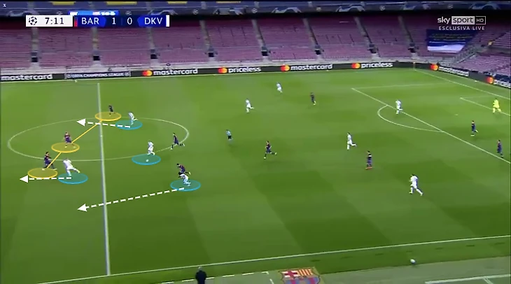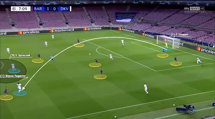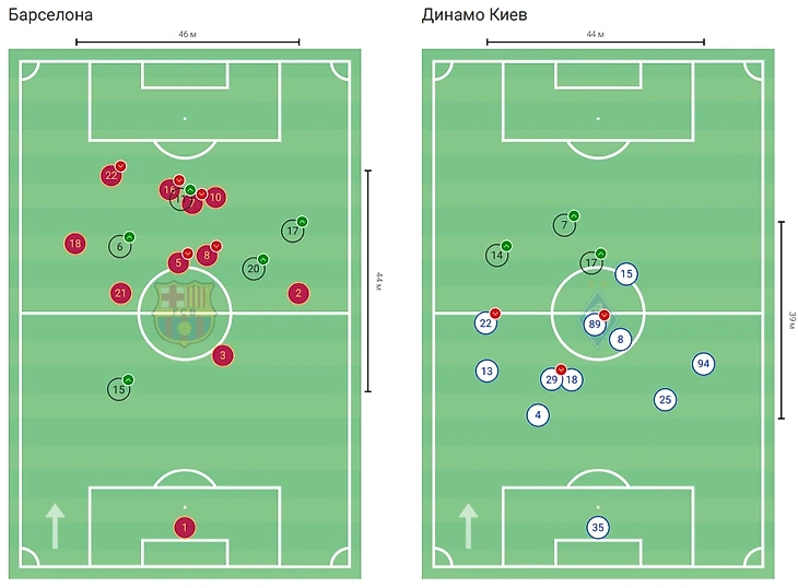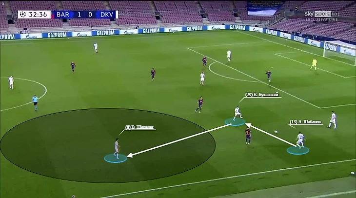 4. «Барселона» в первом тайме старалась высоко прессинговать киевлян, но эти действия лишь обозначали прессинг. Даже «Динамо», со всеми своими проблемами и без Шапаренко, спокойно выходило из-под такого давления. И сразу же получало огромное пространство в центре поля. Отсутствие компактности в структуре каталонцев давало команде Луческу возможность проводить свои быстрые атаки за счет скорости Жерсона, Цыганкова, Буяльского, а также умной игры Андриевского, который постепенно освоился на поле.