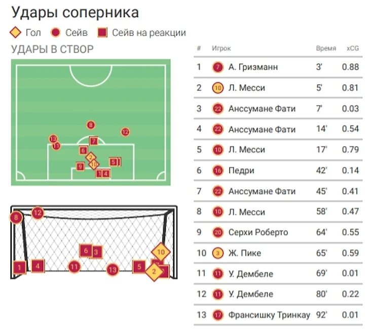 9. Второй тайм в исполнении «Динамо» – лучшее, что показывала команда Луческу в этом сезоне. Показатель xG киевлян в этой игре – 2,14 (у «Барселоны» 3,7). Большая часть (1,89) пришлась как раз на вторую половину игры. Создали четыре стопроцентных момента, из которых реализовать удалось только один. Когда мы хвалим Нещерета, не стоит забывать и о Тер Штегене. Немецкий голкипер провел не менее классный матч. Шесть сейвов, три выигранные дуэли один в один.