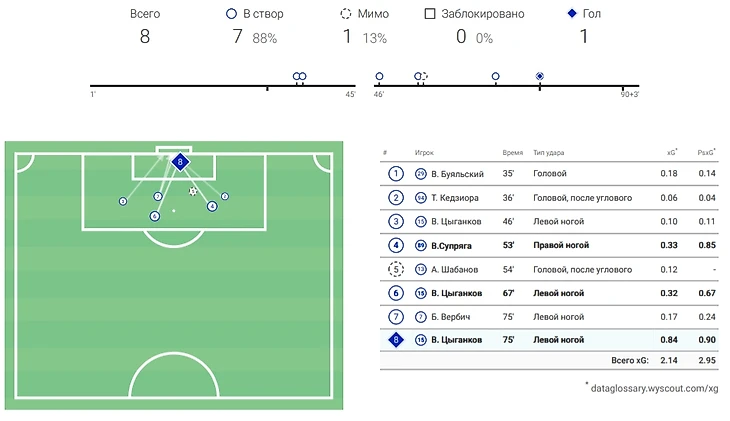 У «Динамо» чаще других бил по воротам как раз Цыганков – 3 удара, все точные, один гол. Еще по разу пробивали Буяльский, Шабанов, Вербич, Кендзера и Супряга. Последний вновь провалился и был одним из худших на поле в составе «бело-синих». Влад продлил свою безголевую серию до восьми матчей. За 70 минут на поле он нанес один удар (тот самый, после выхода на тер Штегена), выиграл всего два единоборства из девяти, заработал один фол и ни разу не обыграл соперника один в один.