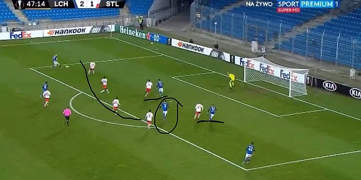 На скрине снизу видно, как Педру Тиба (недавно восстановившийся после травмы) готовится выполнить подачу на набегающего в штрафную Михала Скураща, которого никто не опекает! Двое других футболиста "Леха" стягивают на себя внимание защитников, тем самым позволяя Скуращу нанести прицельный удар головой.