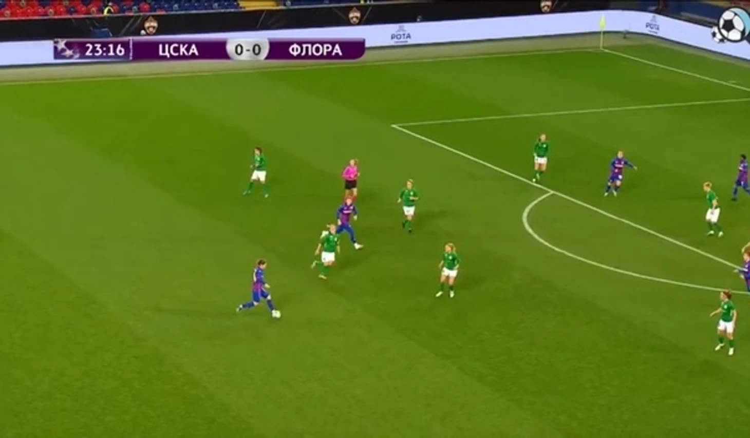 Впрочем, пока левая защитница ЦСКА получила мяч, обработала его и обвела первую соперницу, "Флора" уже грамотно расставилась. У Мануйловой было три варианта - отдать на Смирнову (но через центр весь тайм пробиться было невозможно), отдать на угол штрафной (чего не было сделано), либо вернуть мяч открывающейся Черномырдиной (однако пас не прошел, атака загублена).
