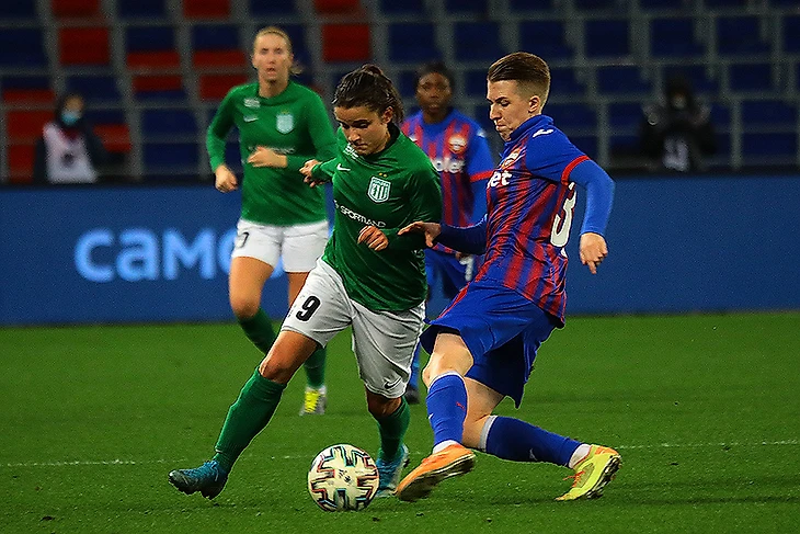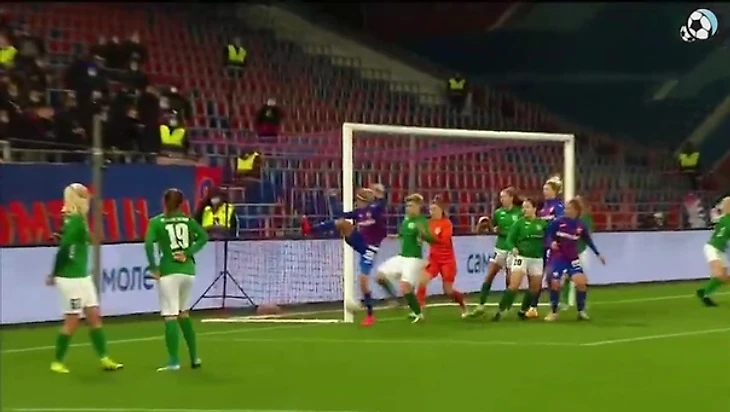 Именно так ЦСКА в итоге и забьет. Первый гол - после стандарта и забегания Плешковой на ближнюю штангу. Снова 8 человек на крайне малом клочке земли - попадание в штангу - серия рикошетов - и гол. Дебютный мяч москвичек в Лиге Чемпионов записан, как ни странно, на автора штрафного удара Надежду Смирнову.