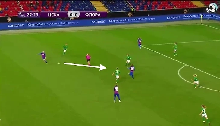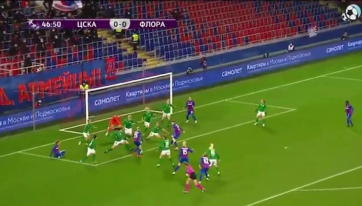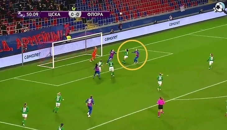 Для ЦСКА вообще минувшая неделя ознаменовалась сюрпризами от команд, которые вроде бы как носили статус аутсайдера. "Чертаново" в рамках Суперлиги неожиданно вышло с пятью защитниками вместо привычных четырех, игроки четко страховали друг друга и свели столичное дерби с лидером чемпионата вничью - 1:1. "Флора" тоже удивила. Чем? Именно глубиной своей обороны. Очень часто (да почти всегда, см. ниже), эстонки оборонялись в 9 полевых игроков. Это четверка защитников и пять игроков полузащиты. На острие - только форвард, Геттер Саар.