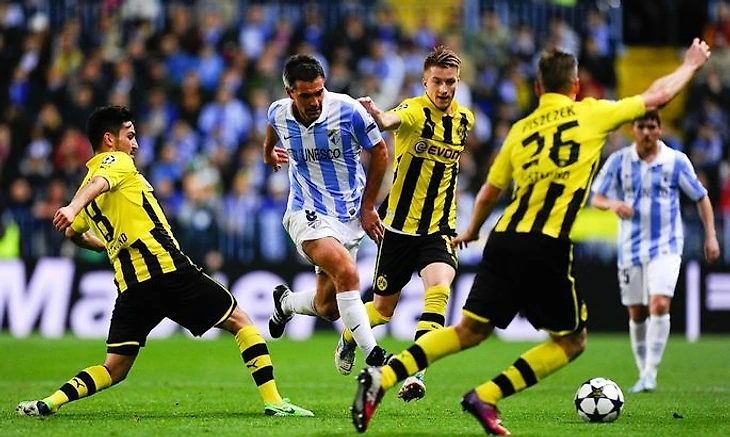 Соперником испанцев по четвертьфиналу стала грозная дортмундская "Боруссия". Первый матч завершился нулевой ничьей. "Малага" выигрывала "шмелей" по ходу второго поединка со счетом 2:1. Однако, в дополнительное время "Боруссия" все же смогла забить два мяча. 90+1' – забивает Ройс, 90+3' забивает Сантана. "Малага" играла на равных с один из сильнейших клубов Европы – "Боруссией" Клоппа, с Вайденфеллером, Суботичем, Гюндоганом, Ройсом, Гетце, Левандовски в составе.