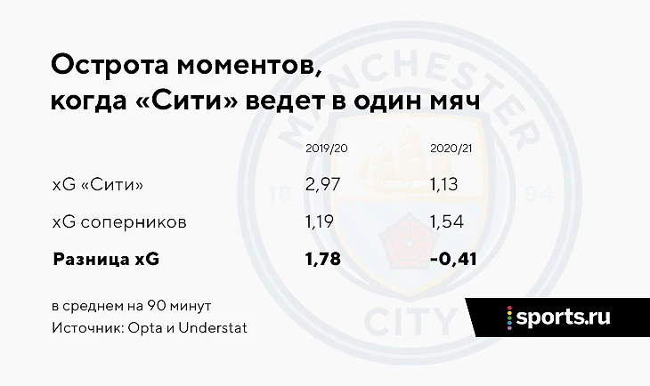 Со старта сезона «Сити» провел 234 минуты, ведя с разницей в один гол. Пока это самый частый сценарий в матчах. Он срабатывал в пяти играх из шести. Падение «Сити» в этой фазе пугает. В прошлом сезоне команда буквально уничтожала соперника, когда вела в один гол – шикарно пользовалась свободными зонами в атаке и неплохо контролировала в защите. Сейчас – большие перемены. «Сити» сильно хуже атакует и просто хуже защищается, когда ведет в один мяч. Итог – соперник создает даже более острые моменты.