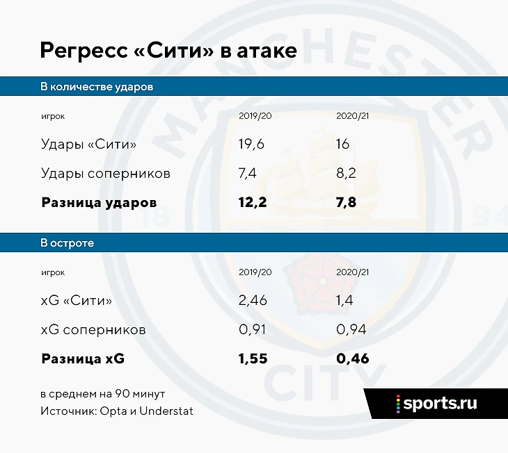 Удары – совсем базовый показатель, но он помогает это рассмотреть. В прошлом сезоне «Сити» наносил на 12 ударов больше своего соперника в среднем за матч. В этом – только на 8. Это все еще неплохая разница, если не учитывать остроту ударов. Тут – катастрофическое падение. «Сити» сохранил цифры в обороне, но ужасно просел в атаке – команда создает примерно на 1 xG меньше за игру по сравнению с прошлым сезоном.