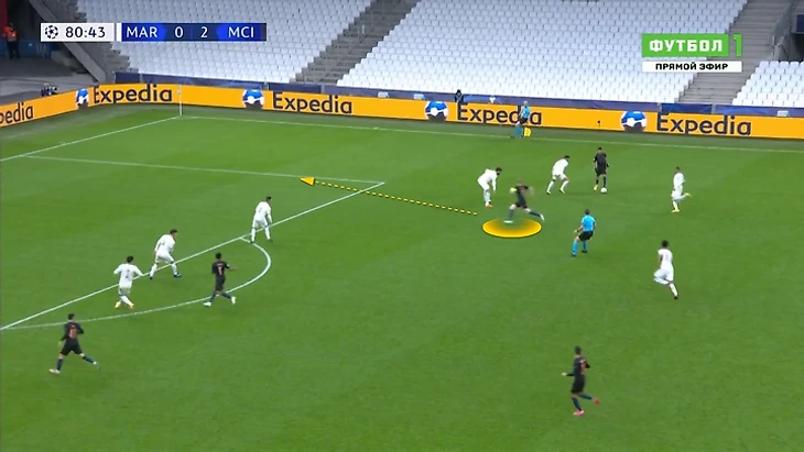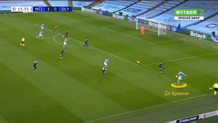 Важность Кевина для фланговой игры ярко просматривалась в последних трех матчах. Против «Марселя» он сделал фирменный ассист после рывка в полуфланг, против «Шеффилд Юнайтед» – после перегрузки левого, против «Олимпиакоса» – после комбинации с Марезом справа. Их вариативность с Риядом помогла «Сити» прибавить в атаке. Ниже – два примера взаимодействия.