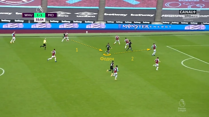 Первый – Фоден видит, что Стерлинг заблокировал одного из центральных защитников «Вест Хэма», поэтому открывается между линиями. Далее принимает и выводит Рахима в касание: