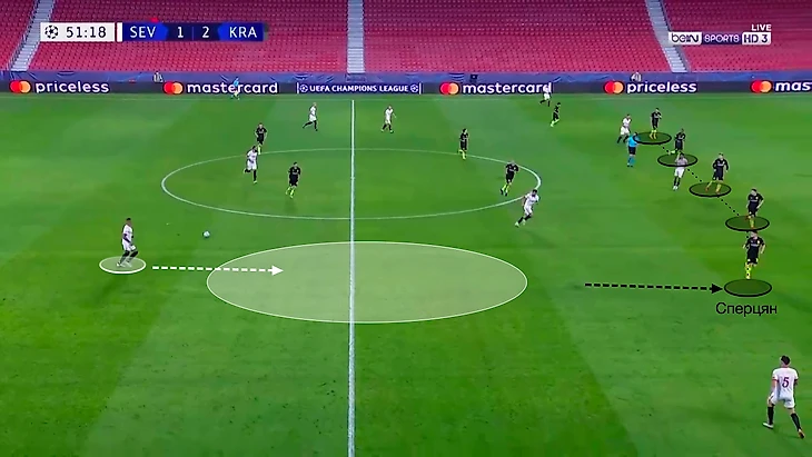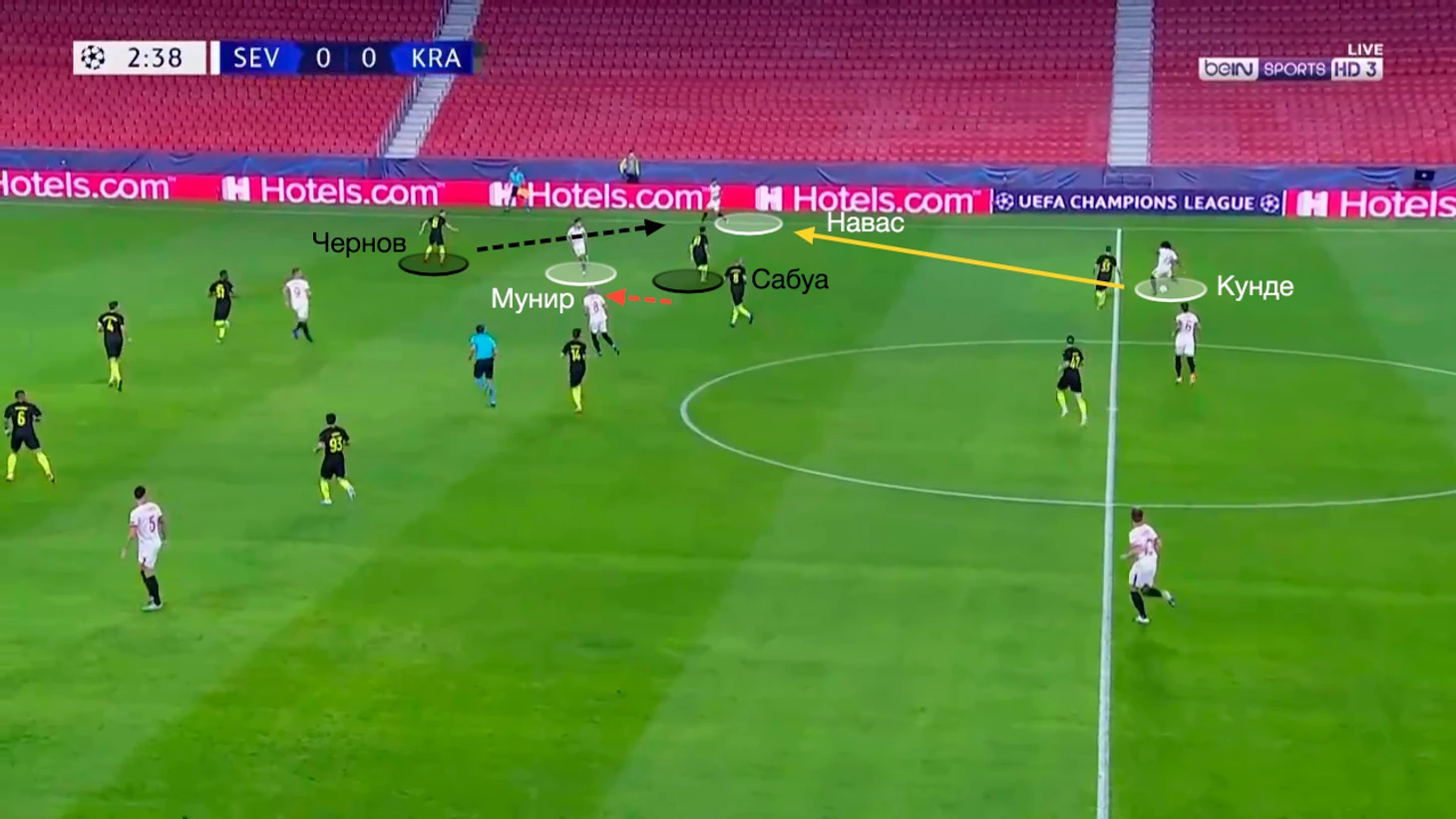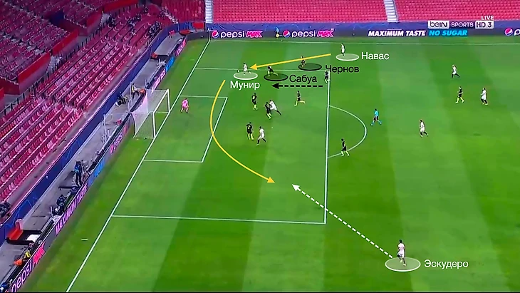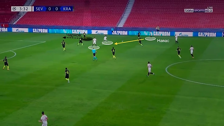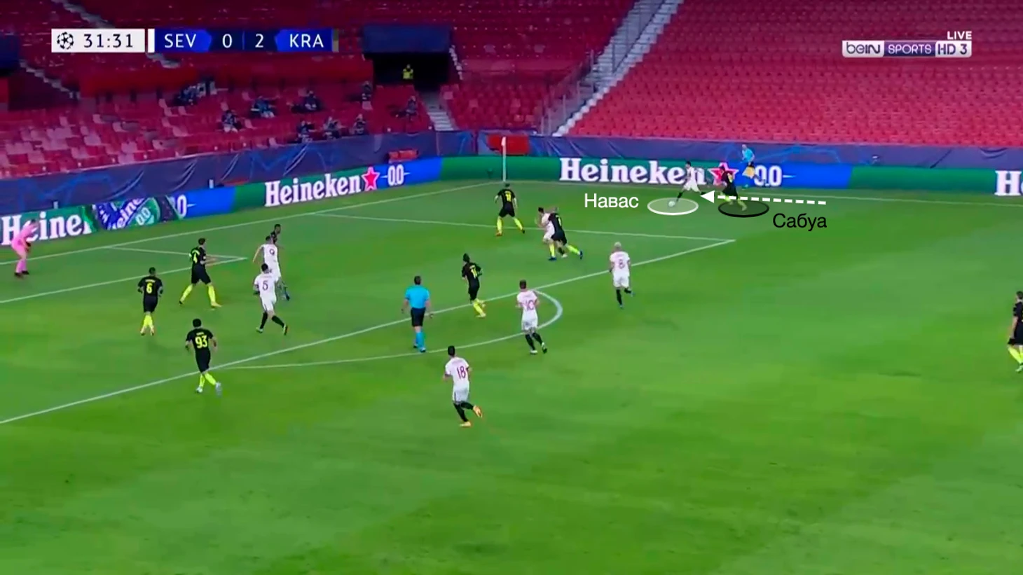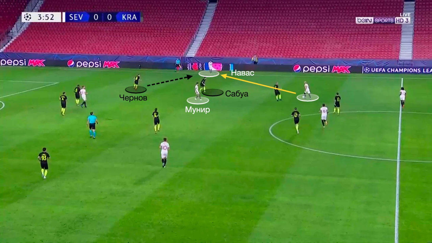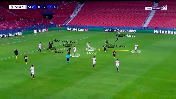 Сабуа первоначально, казалось бы, естественным образом реагирует на своего прямого оппонента – крайнего защитника, к тому же находясь к нему ближе всех. Однако затем, он получает подсказ от Чернова переключиться на Мунира в полуфланге и делает рывок вместе с вингером «Севильи» за спину Чернову, а сам Чернов по более длинной траектории выходит на Наваса.