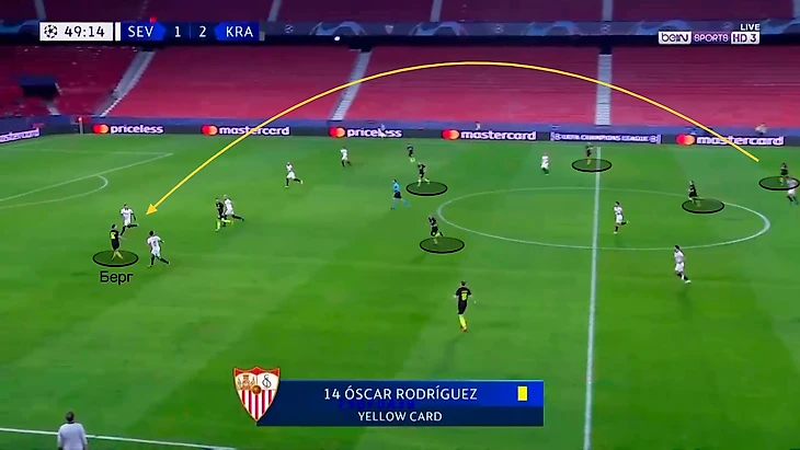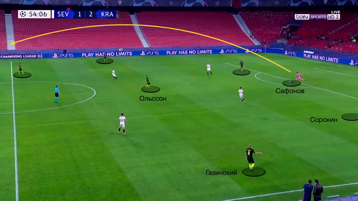 «Севилья» продолжала бомбить гостей крутыми кроссами с одного фланга на другой. Чернов, оставаясь с Окампасом в изоляции, не мог ничего ему противопоставить в игре 1-в-1 – 10 успешных обводок из 14. Сперцян также не успевал за динамикой игры и позже был заменён на Классона.