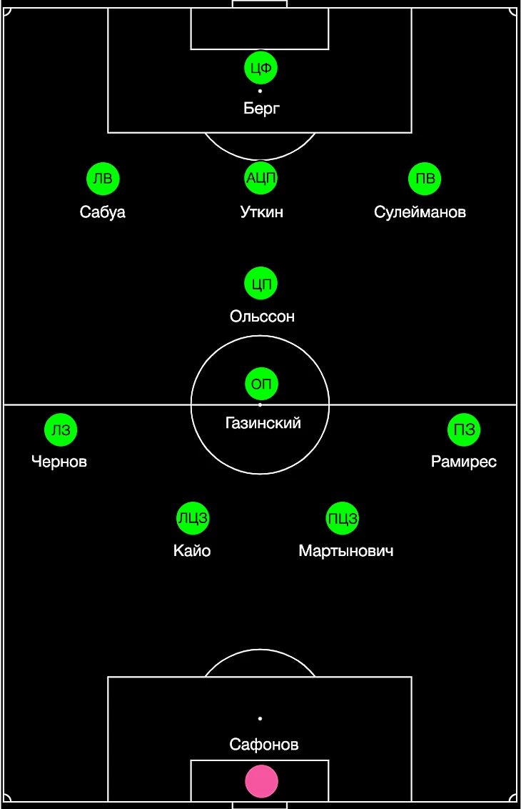 Мусаев лишён возможности манёвра с составом – выходят те, кто остался здоровым. Так с первых минут вышел Леон Сабуа на позиции левого полузащитника. Рамирес занял место правого полузащитника. Единственная позитивная новость: появление в запасе двух лидеров «чёрно-зелёных» - Вандерсона и Классона.