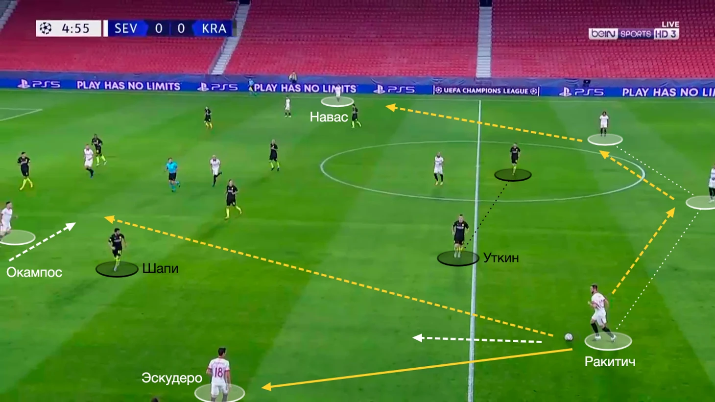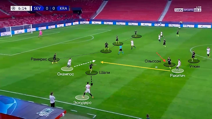 Если Уткин не успевал перестроиться, Ракитич двигался сам через пустой полуфланг, выдёргивая на себя Шапи. В обратном случае мог развернуть атаку через центральных защитников к Навасу. Слишком узкое расположение Шапи давало свободу Эскудеро. Смещение Окампоса глубоко в полуфланг регулярно ставило Шапи перед сложным выбором – за кого ему собственно отвечать. Вот более динамичный момент: