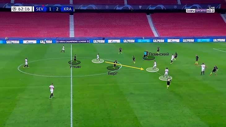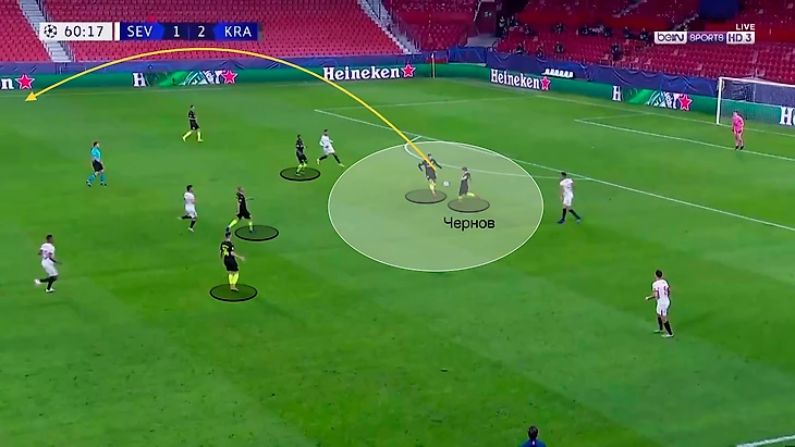 У самого Чернова в этой игре особенно ярко проявилась черта, которой игроки «Севильи» регулярно пользовались. Левый защитник «быков» панически боится передач за спину, из-за чего он оставляет перед собой пустую зону, которой пользуются вингеры, играющие на противоходе «в отвал»: